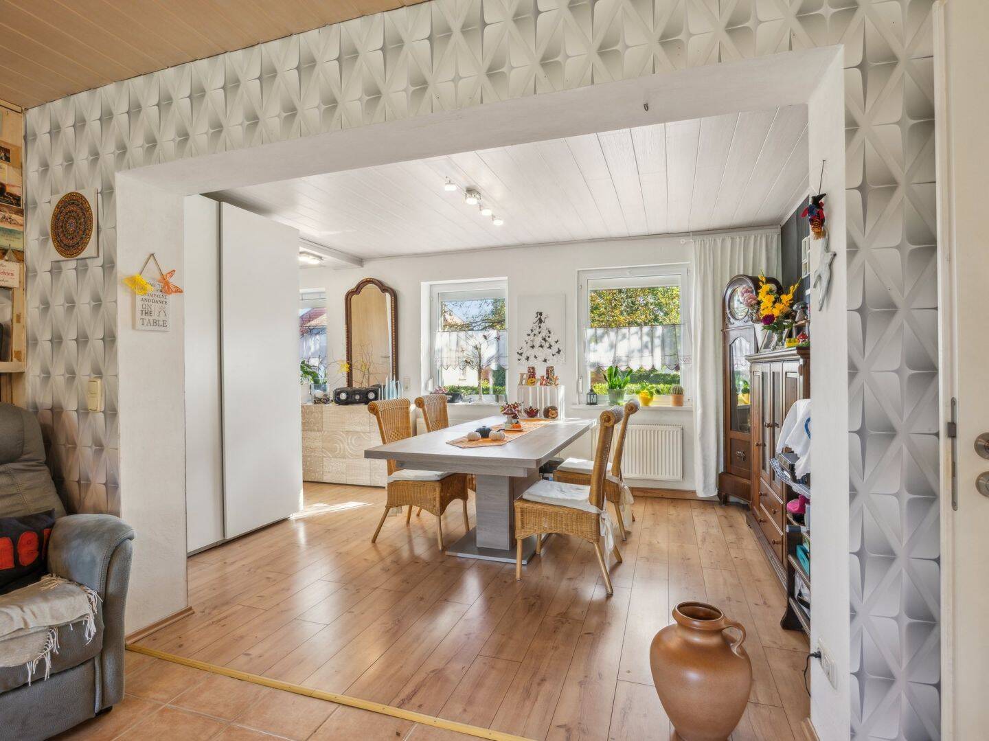 Das ursprünglich um ca. 1890 errichtete Zweifamilienhaus wurde ab ca. 1990 umfassend modernisiert und befindet sich in einem gepflegten Zustand. Das Haus eignet sich sowohl für Familien als auch für Mehrgenerationenwohnen oder als Kombination aus Wohnen und Vermietung. Auch ein Umbau zum Einfamilienhaus ist möglich.Die Gesamtwohnfläche beträgt ca. 224?m² und verteilt sich auf zwei abgeschlossene Wohneinheiten, die derzeit im Erdgeschoss miteinander verbunden sind. Wohnung 1 bietet auf ca.140?m² ein großzügiges Wohnzimmer mit Essbereich und einem gemütlichen Kaminofen, ein Durchgangszimmer, dahinter ein Schlafzimmer, eine abgeschlossene Küche, ein modernes Bad mit ebenerdiger Dusche, Wanne und Fußbodenheizung sowie einen Wirtschaftsraum im Erdgeschoss. Im Dachgeschoss befinden sich zwei weitere Schlafzimmer und ein Bad.Wohnung 2 verfügt über ca. 84?m² Wohnfläche, ebenfalls verteilt auf zwei Etagen. Im Erdgeschoss befinden sich derzeit eine Küche und ein Badezimmer. Im Dachgeschoss stehen zwei weitere Zimmer zur Verfügung.Das Haus wurde in Massivbauweise errichtet. Im Dachgeschoss wurden zwei Trockenbauwände ergänzt. Die Decken bestehen aus Holzbalkenkonstruktionen, im Kellerbereich teilweise mit Gewölbedecke. Das Dach ist als Satteldach mit gedämmtem Spitzboden ausgeführt. Die isolierten Holzfenster mit teils innen- und außenliegenden Sprossen sind größtenteils mit Außenjalousien ausgestattet. Die Fußböden bestehen aus Holzbalkenkonstruktionen und sind je nach Raum mit Laminat, Fliesen oder PVC-Belag versehen. Die Sanitärbereiche wurden in beiden Wohnungen modernisiert. Die Elektrik wurde mit Kupferleitungen ausgeführt. Ein Glasfaseranschluss ist vorhanden.Ca. 2015 wurden sowohl die Dacheindeckung mit Tondachsteinen als auch die Fassade mit Wärmedämmung und Putz erneuert. Eine Pelletheizung mit Pufferspeicher folgte ca. 2020, ebenso ein elektrisch betriebenes Hoftor.Das ca. 1.894 m² große Grundstück ist gepflegt und vielseitig nutzbar. Terrassenbereiche, ein Gewächshaus sowie ein kleiner Nutzgarten schaffen eine angenehme Umgebung für Erholung und Gartenarbeit. Eine massiv erbaute Scheune bietet zusätzlichen Raum für Hobby, Lagerung oder Handwerk. Sie umfasst zwei Garagen, diverse Abstellflächen sowie den Heizungsraum.Lassen Sie sich gern bei einer Besichtigung von diesem Angebot begeistern! Wir freuen uns auf Ihren Anruf unter 0151 647 502 58 - aber auch gern per Mail: [email protected]. Sollten Sie noch keine passende Finanzierung haben oder ein Vergleichsangebot wünschen, sind wir gern behilflich.