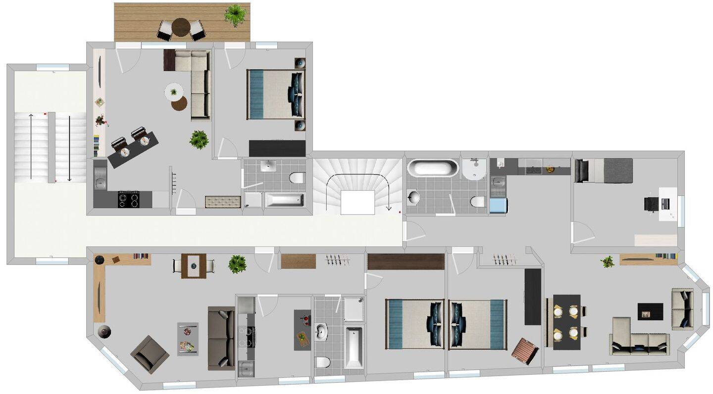 Das Wohn- und Geschäftshaus umfasst eine großzügige Gewerbeeinheit im Erd- und 1. Obergeschoss sowie 8 Wohnungen mit 1½ bis 3½ Zimmern und Wohnflächen von ca. 47 bis 116 m², teils mit Balkon oder Loggia. Das Kellergeschoss bietet Kellerräume, Fahrradraum, Waschküche und Heizungsraum. Hinter dem Haus stehen vier Stellplätze zur Verfügung.