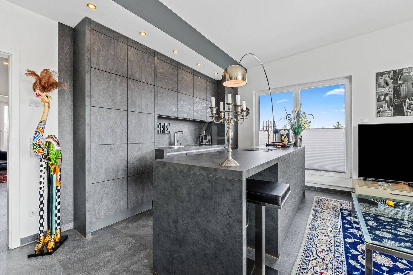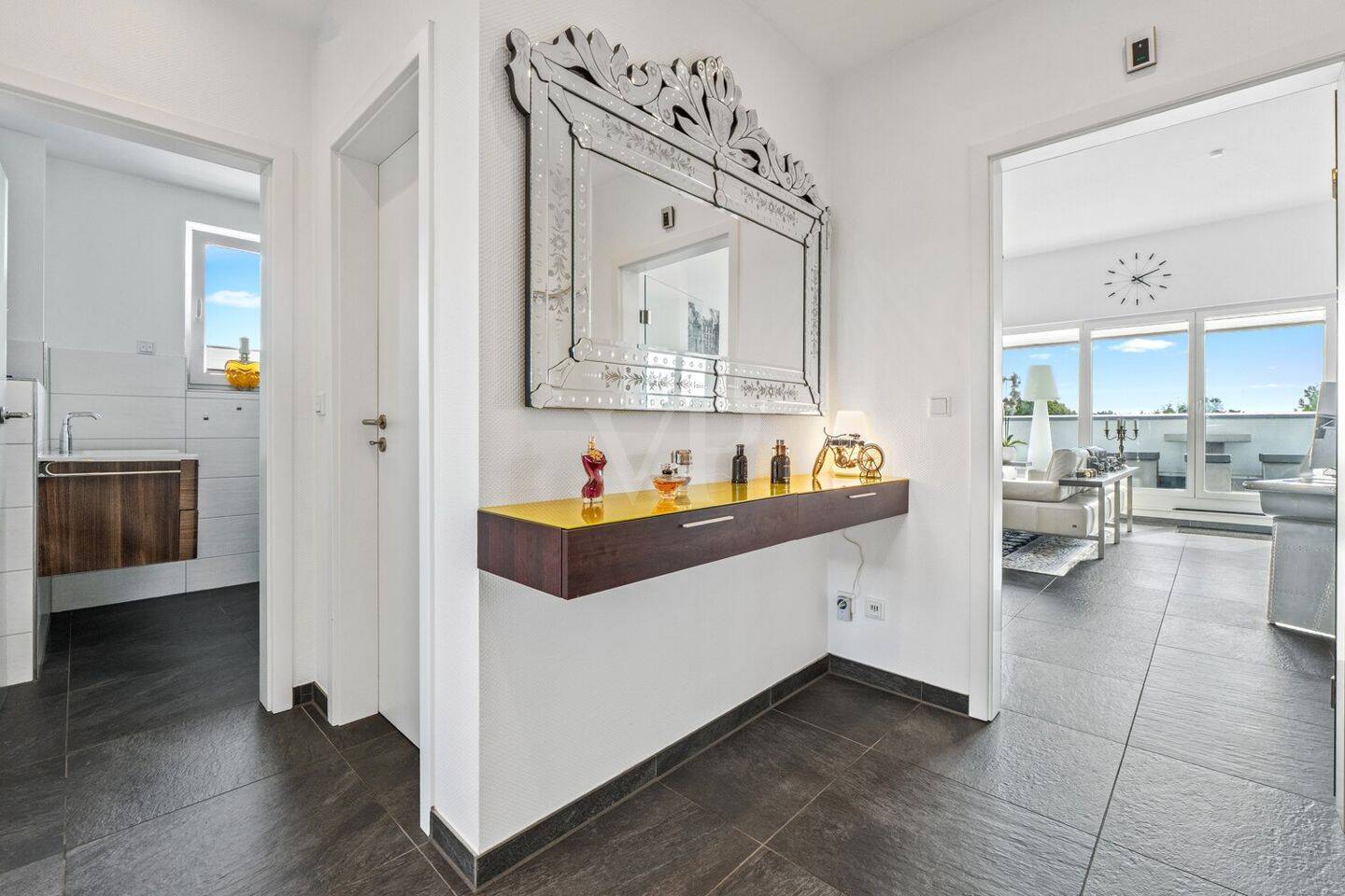 Willkommen in einer Immobilie, die zeitgemäßen Komfort mit architektonischer Finesse verbindet und dabei Standards für Exklusivität und Qualität setzt. Dieses Zuhause befindet sich in einem sorgfältig geplanten acht-Parteien-Haus, das auf modernste Bauweise sowie hohe Energieeffizienz (KfW-70-Haus) ausgelegt ist. Hier entfaltet sich ein Rückzugsort für Menschen mit Anspruch und Gespür für das Besondere.Ein Aufzug bringt Sie in Ihr privates Refugium. Der durchdachte Grundriss umfasst zwei Zimmer, darunter ein großzügig bemessenes Schlafzimmer und einen Wohn-/Essbereich mit offener Küche. Dieser eröffnet mit seinem Zugang zu der Dachterrasse eine einladende Atmosphäre, in der Genuss, Gemeinschaft und stilvolles Ambiente nahtlos ineinanderfließen.Die Einbauküche der renommierten Marke Nolte - ausgestattet mit einem hochwertigen Bora-Dunstabzug, Induktionsherd und Siemens-Markengeräten - fügt sich als dezentes Statement moderner Funktionalität in das Wohnkonzept ein.Das Tageslicht-Badezimmer setzt mit einem Doppelwaschtisch und eleganten Armaturen stilvolle Akzente. Die Liebe zum Detail zeigt sich in der Auswahl besonderer Materialien: Wände mit Glasfasertapete, sehr schöne Steinfliesen in allen Räumlichkeiten und eine Fußbodenheizung, die für behagliche Wärme sorgt. Elektrische Rollläden sowie bodentiefe Kunststofffenster mit Dreifachverglasung unterstreichen die sorgfältige Balance aus Licht, Komfort und Energieeffizienz. Die großzügige Deckenhöhe mit einer Höhe bis zu ca. 3,15 Metern vermittelt zusätzliches Raumgefühl und betont den exklusiven Charakter dieser Wohnung.Ein Abstellraum bietet durchdachten Stauraum und Struktur im Alltag. Einer der Höhepunkte dieses Domizils ist zweifellos die große Dachterrasse mit Süd-West-Ausrichtung: Hier beginnen und beenden Sie den Tag mit faszinierenden Lichtstimmungen und einem Panorama vom Siebengebirge bis zur Wahner Heide.Diese Wohnung verkörpert ein Qualitätsversprechen, welches sich an Menschen richtet, die das Außergewöhnliche suchen und Wert auf repräsentativen Wohnraum legen. Ein Zuhause, das Sie mit jeder Facette begeistern wird.Ein Kellerraum bietet genügend Stauraum. Zwei Tiefgaragenstellplätze runden dieses Angebot ab.
