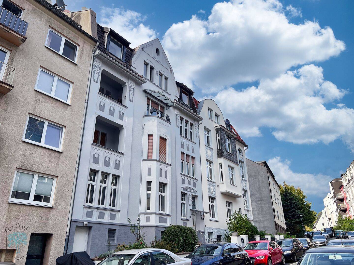 Zum Verkauf steht eine großzügige und modern ausgestattete 4-Zimmer-Eigentumswohnung im 2. Obergeschoss eines gepflegten Mehrfamilienhauses in Wuppertal-Katernberg. Die Wohnung überzeugt durch eine durchdachte Raumaufteilung, hochwertige Materialien und einen außergewöhnlichen Ausblick. Von der großen Terrasse genießen Sie einen unverbauten Blick bis nach Düsseldorf.Die Immobilie bietet neben einer Garage auch einen zusätzlichen Stellplatz - ein echtes Plus in dieser beliebten Lage.Besonders hervorzuheben sind die zahlreichen Modernisierungen:Fenster: vollständig erneuert in den Jahren 2022-2024Heizung: Öl-Zentralheizung vor ca. 10 Jahren erneuert, Gas-Leitungen bereits vorhanden - ein Umstieg auf Gas ist im Rahmen der nächsten Modernisierung (voraussichtlich in 10-15 Jahren) vorgesehenSanitäreinrichtungen: Gäste-WC 2016 umfassend modernisiert und mit einer zusätzlichen Dusche ausgestattetBöden & Türen: hochwertige Echtholzfliesen in allen Wohnräumen sowie moderne Glastüren sorgen für ein stilvolles AmbienteTerrasse: großzügig, mit unverbautem Panoramablick und praktischer Bewässerungsanlage für PflanzenDie Einbauküche bleibt bestehen. Weitere Einrichtungsgegenstände können bei Interesse kostenlos übernommen werden.Ausstattung4 Zimmer, Küche, Bad, Gäste-WC mit DuscheTerrasse mit Fernblick bis Düsseldorf und Bewässerungsanlagehochwertige Echtholzfliesenmoderne GlastürenEinbauküche inklusiveGarage und zusätzlicher StellplatzÖl-Heizung (ca. 10 Jahre alt) mit Vorbereitung für GasanschlussFenster neu (ca. 2022-2024)Hausgeld: ca. 550 EUR/Monat