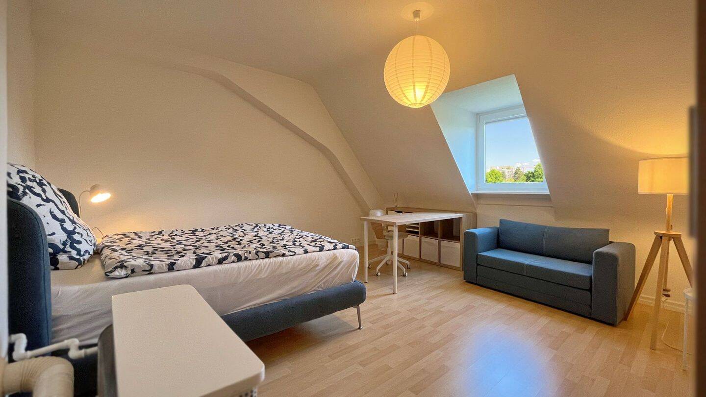 Diese voll möblierte und äußerst gepflegte 2-Zimmer-Wohnung befindet sich im 4. Obergeschoss eines Wohnhauses aus dem Jahr 1950 und überzeugt durch ein komfortables Wohnambiente. Großzügige Gaubenfenster durchfluten die Wohnräume sowie das Badezimmer mit Tageslicht und schaffen eine helle, freundliche Atmosphäre. Der pflegeleichte Vinylboden in Holzoptik sorgt in der Wohnküche für eine warme, einladende Ausstrahlung. Die moderne Einbauküche ist mit Cerankochfeld, Backofen und einer geschickt integrierten Waschmaschine ausgestattet. Die Wohnung ist mit zeitgemäßen Möbeln eingerichtet, die vom Eigentümer übernommen werden können. Ein praktisches Speicherabteil auf derselben Etage sowie ein Kellerabteil im Untergeschoss bieten zusätzlichen Stauraum. Dank der zentrumsnahen Lage eignet sich die Wohnung ideal sowohl für Eigennutzer als auch für Kapitalanleger - und ist auch für eine Studenten-WG bestens geeignet.