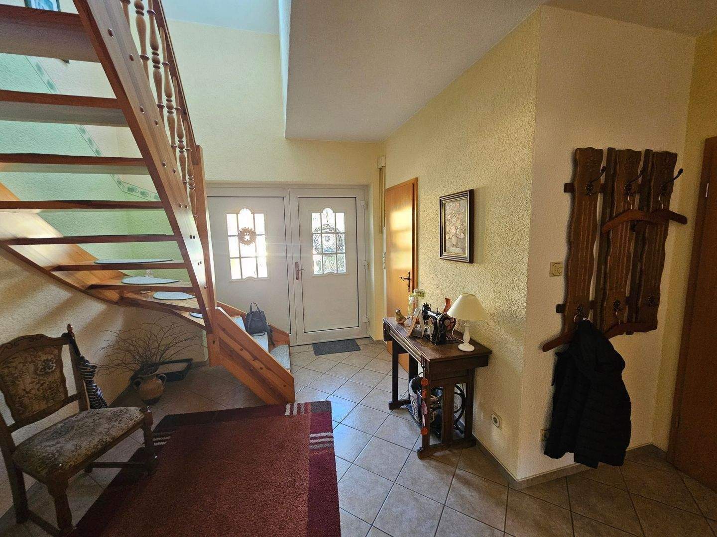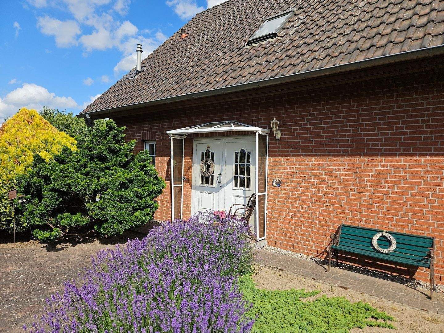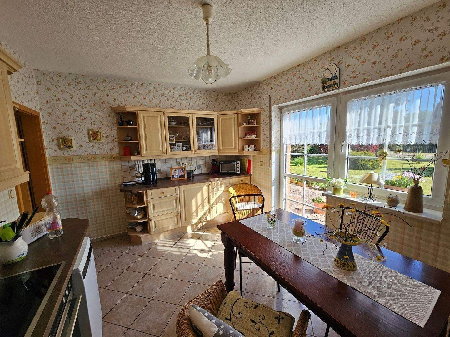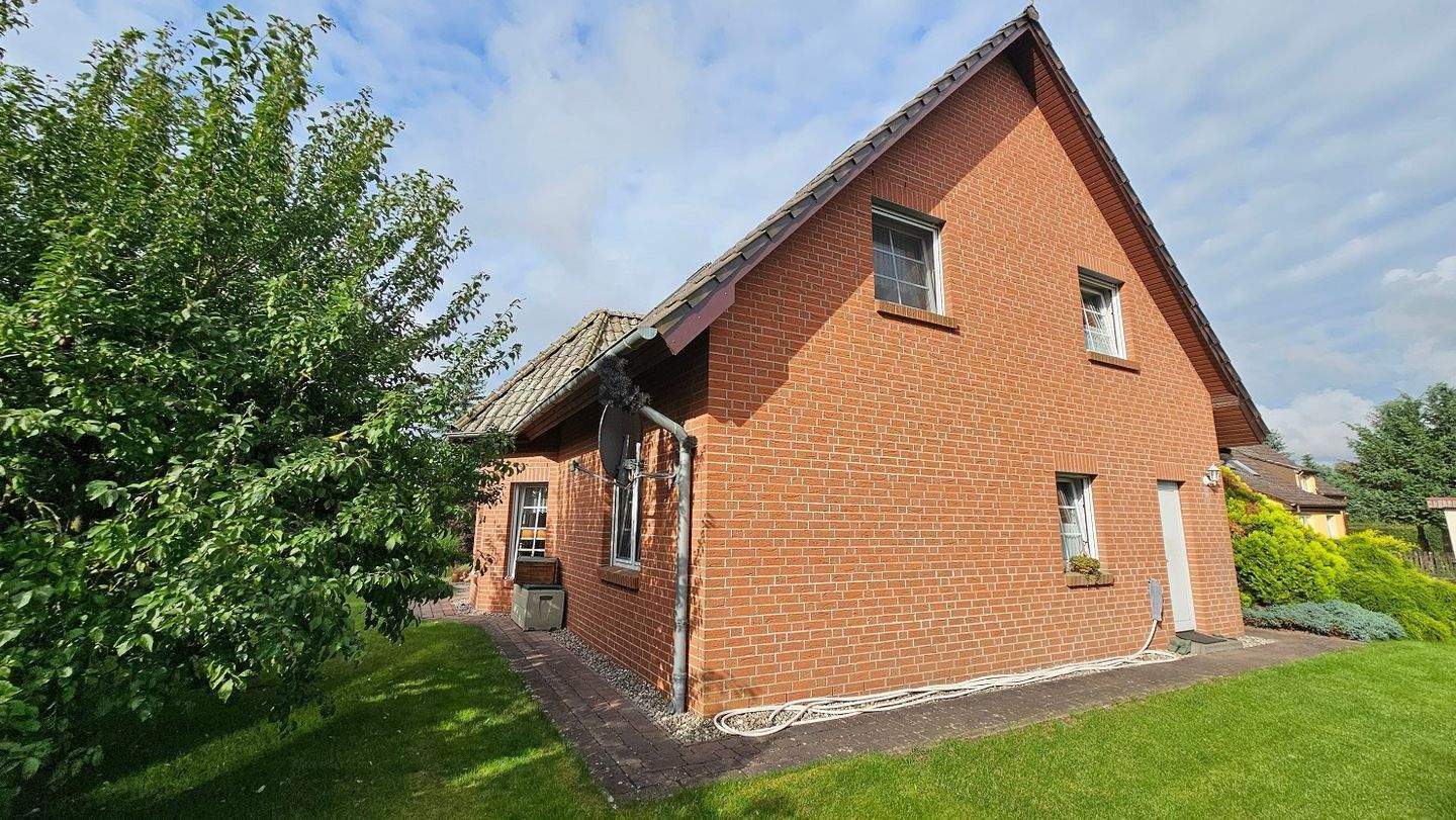 Es werden nur Anfragen mit vollständig ausgefülltem Anfrageformular beantwortet! Etwas zurückgesetzt von der ruhigen Dorfstraße und durch den schönen Bewuchs nicht so schnell einsehbar steht das hübsche Landhaus, eher unüblich im Ort mit der Giebelseite zur Dorfstraße. Links des Grundstückes befindet sich die gut ausgebaute Zufahrt an deren Seiten zur linken eine offene Hecke steht und zur rechten der große Vorgarten mit allerlei, zum Teil blühenden Sträuchern und Büschen locker Bewachsen ist. Die Grenze zum Nachbarn hin ist auch dort als Hecke ausgeführt. Direkt am Hausgiebel Richtung Südsüdwest befindet sich eine Terrasse. Diese ist auch gut über die Terrassentür in der Küche zu erreichen. Die beiden Garagen und der Carport stehen an der Nördlichsten Ecke des Grundstückes und vom Carport oder auch Freisitz hat man einen schönen Blick auf den Nutzgarten und über den hinter dem Haus liegenden Teil des Grundstückes. Zur Bewässerung des Gartens ist eine Zisterne angelegt, in der das anfallende Regenwasser aufgefangen wird. Auch der Gastank ist wie die Zisterne versenkt. Die Zaunanlage mit den Toren zur Dorfstraße hin ist gerade erst vor drei Jahren errichtet worden.Nun zum Haus! Die breite, überdachte Eingangstür ist rechts wie links hübsch eingefasst von Gewächsen. Die große Diele wirkt einladend, hell und geräumig. Gleich links ist der Hauswirtschaftsraum mit genügend Platz für alles was man so benötigt. Dort befindet sich auch eine weitere Tür über die Sie dann schnell zur Garage, zum Wäscheplatz oder zum Garten kommen. In der Diele rechts ist dann die offene ausgeführte ¼ gewendelte Treppe. Dahinter befindet sich die Tür zur Küche und geradezu eine zum Wohnzimmer sowie eine zum Schlafzimmer. Links ist dann noch eine Tür zum voll gefliesten Duschbad (siehe Grundriss). Wie schon oben erwähnt können Sie aus der geräumigen Küche gleich auf die Terrasse gehen. Diese kann durch die elektrische Markise in Teilen beschattet werden.Im Obergeschoss finden Sie neben dem großen Badezimmer noch drei weitere Zimmer und eine Kammer. Im hellen Flur des Dachgeschosses ist dann noch eine Luke über die Sie in den aufgeräumten Spitzboden kommen. Auch dieser ist durch die Dachfenster hell und freundlich. Die Alufenster im Haus sind alle mit Sprossen versehen und können mittels Rollos abgedunkelt werden. Das Haus wird mit einer Gasheizung beheizt. Im Erdgeschoss ist die Küche, die Diele und das Wohnzimmer mit einer Fußbodenheizung ausgestattet und im Obergeschoss das große Bad. Diele, Hauswirtschaftsraum, Bäder und die Küche sind gefliest. Im Wohnzimmer ist Laminat verlegt und die anderen Zimmer sind mit Teppichboden ausgelegt.Die Hauseigenen Abwässer fließen in die vollbiologische Kläranlage. Wasser-, Strom und Telefonleitung liegen an. Die Grundrisse vom Erd- und Dachgeschoss sind in dieser Anzeige als PDF-Datei zu finden. Das Wohnzimmer und das Schlafzimmer im Erdgeschoss lassen sich hier auch zu einem sehr großen Zimmer umbauen.Trotz des allgemein „sehr Guten“ Zustandes ist darauf hinzuweisen, dass an und in den Gebäuden mit den Jahren weiterhin Instandhaltungs- und Renovierungsarbeiten anfallen werden. Die in diesem Angebot enthaltenen Angaben basieren auf Informationen der Auftraggeber, sowie eigenen. Wir bemühen uns, über Objekte und Vertragspartner möglichst vollständige und richtige Angaben zu erhalten. Eine Haftung für die Richtigkeit und Vollständigkeit können wir nicht übernehmen. Ein Zwischenverkauf des Objektes bleibt vorbehalten.