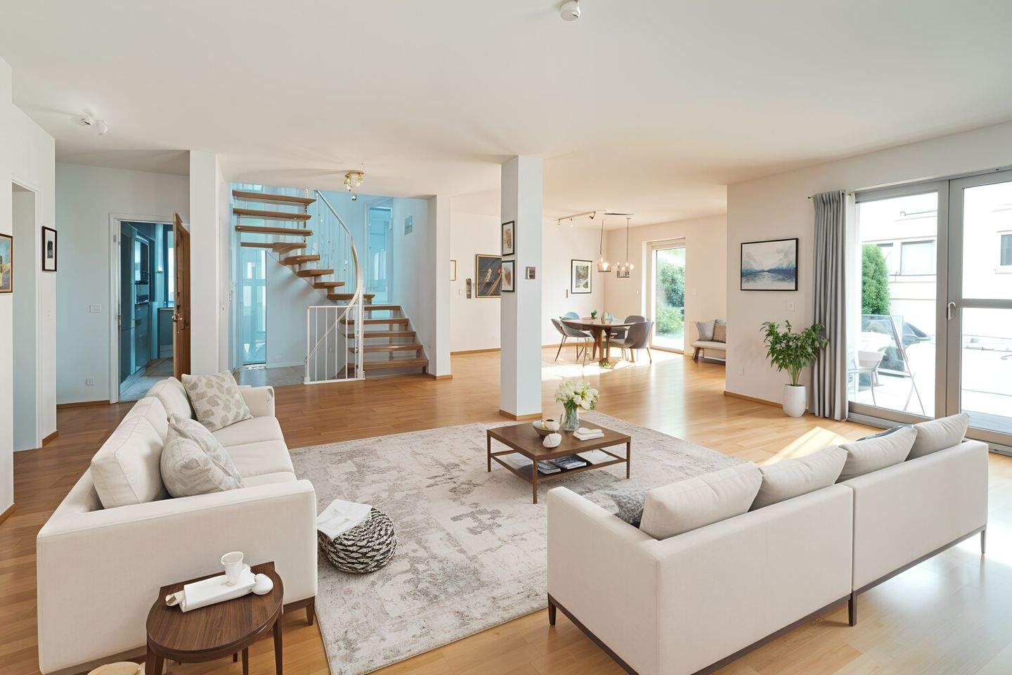 Erdgeschoss - lichtdurchflutet und großzügigBereits beim Betreten des Hauses empfängt Sie ein großzügiger Wohn- und Essbereich, dessen offene Gestaltung und weitläufige Fensterfronten eine lichtdurchflutete und einladende Atmosphäre schaffen. Direkt angrenzend befindet sich die moderne, helle Küche, die harmonisch in das Raumkonzept eingebunden ist. Gleich drei Zugänge führen vom Wohnbereich direkt auf die sonnige Terrasse mit elektrischer Markise, die zu entspannten Stunden im Freien einlädt. Ein separates Zimmer bietet sich ideal fürs Homeoffice oder als Gästezimmer an. Abgerundet wird das Erdgeschoss durch ein Gäste-WC mit Dusche und eine Garderobe. Für zusätzlichen Komfort sorgt die im gesamten Erdgeschoss verlegte Fußbodenheizung.Obergeschoss - gemütlich und komfortabelEine elegante, offene Treppe führt in das Obergeschoss, wo ein großzügiges Schlafzimmer sowie drei weitere Zimmer auf Sie warten. Durch die Dachschrägen entsteht eine behagliche und wohnliche Atmosphäre. Alle Schlafzimmer sind mit Klimageräten ausgestattet, die auch an heißen Sommertagen ein angenehmes Raumklima gewährleisten. Das Badezimmer überzeugt durch Großzügigkeit und Helligkeit: Ausgestattet mit Dusche, Badewanne, Bidet und WC, einem Doppelwaschbecken sowie zwei Fenstern und einer Fenstertür bietet es eine freundliche und offene Gestaltung. Die Fußbodenheizung im Badezimmer sorgt für zusätzliche Behaglichkeit.Kellergeschoss - vielseitig und einladendDas Untergeschoss bietet weit mehr als nur Abstellfläche: Zwei wohnlich ausgebaute Gästezimmer zählen zur Wohnfläche und eröffnen zahlreiche Nutzungsmöglichkeiten - ob für Gäste, Hobbys oder als eigener Bereich für Jugendliche. Ein weiteres Badezimmer mit Dusche und WC erhöht den Komfort. Zusätzlich stehen drei praktische Kellerräume zur Verfügung, die viel Stauraum für Hauswirtschaft, Vorräte oder eine Werkstatt bieten.Außenbereich - sonnig, gepflegt und praktischDie großzügige Terrasse ist gleich von drei Seiten des Wohnbereichs zugänglich und mit einer elektrischen Markise ausgestattet - perfekt, um sonnige Nachmittage oder laue Abende im Freien zu genießen. Ein Gartenhäuschen sorgt für zusätzlichen Stauraum und Platz für Gartengeräte. Eine Doppelgarage sowie 3 Stellplätze davor bieten bequeme Parkmöglichkeiten.Energie & Technik - modern und nachhaltigNeben der Gaszentralheizung unterstützt eine Warmwasseraufbereitung über zwei Solarpaneele auf der Dachfläche die Versorgung - ein Pluspunkt für Umwelt und Energiekosten. Diese moderne Ergänzung steigert die Energieeffizienz des Hauses und rundet die Ausstattung sinnvoll ab.Fazit - Ihr neues Zuhause mit WohlfühlgarantieDieses freistehende Einfamilienhaus verbindet großzügige Raumgestaltung, hochwertige Ausstattung und ein gepflegtes Ambiente. Mit rund 209 m² Wohnfläche, zusätzlichen 73 m² Nutzfläche, vielen Extras wie Fußbodenheizung, Klimageräten, Gartenhäuschen und Solartechnik ist es das ideale Zuhause für Familien, die Wert auf Komfort, Helligkeit und Wohnqualität legen.