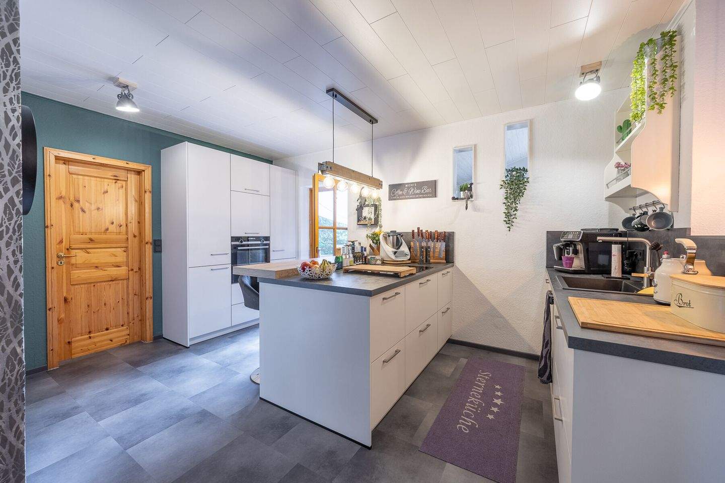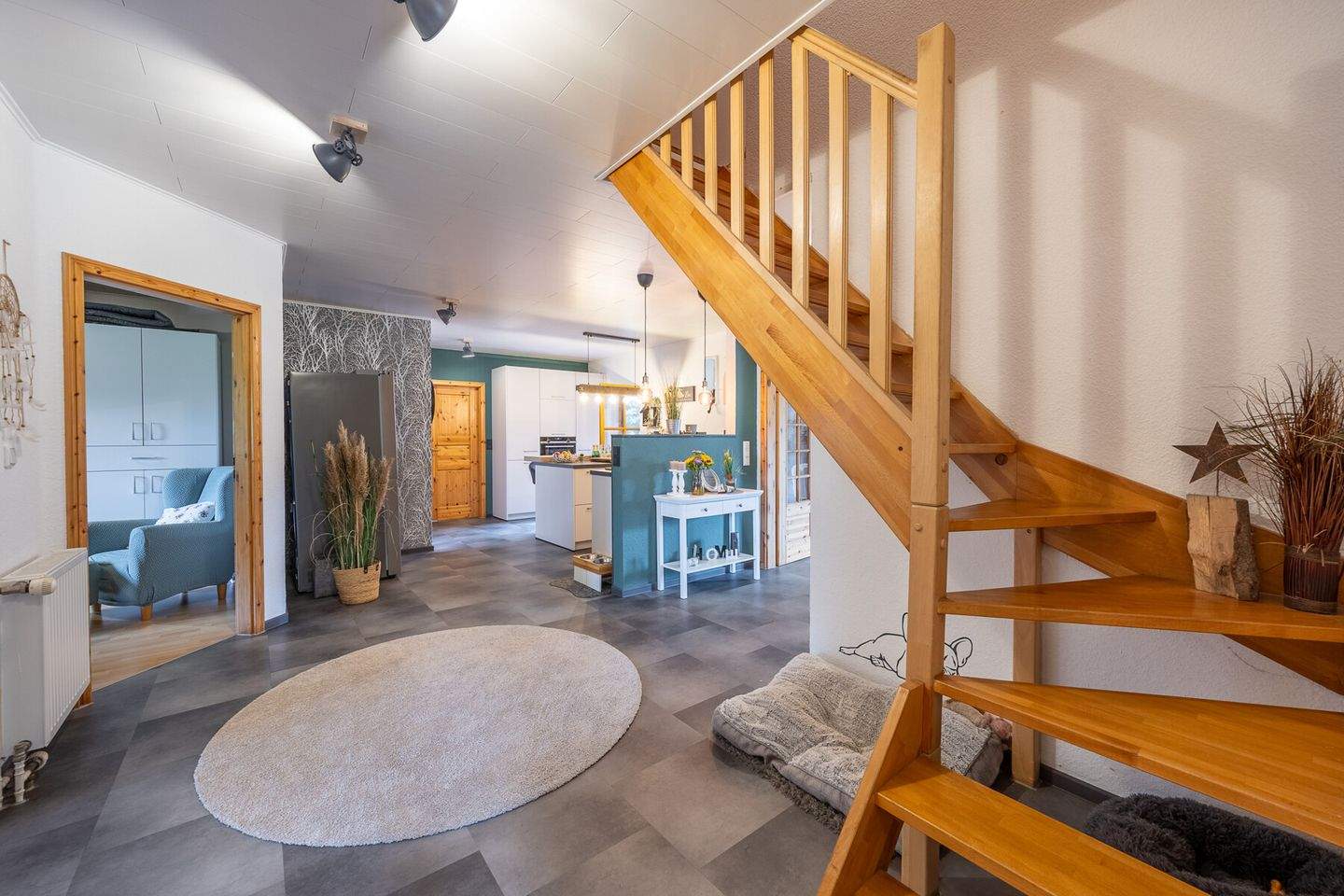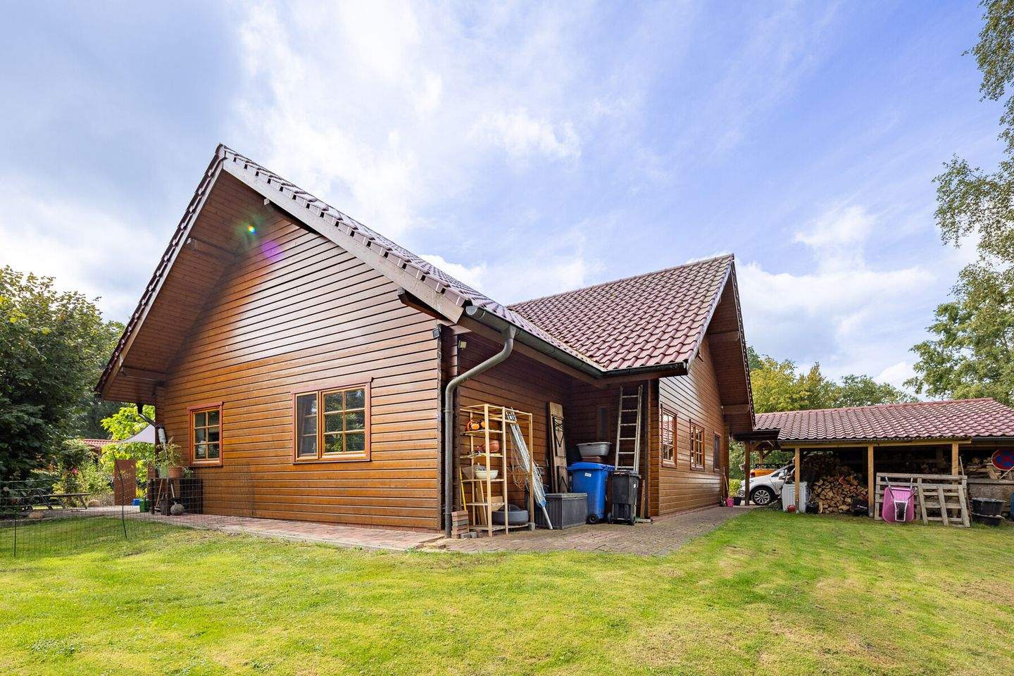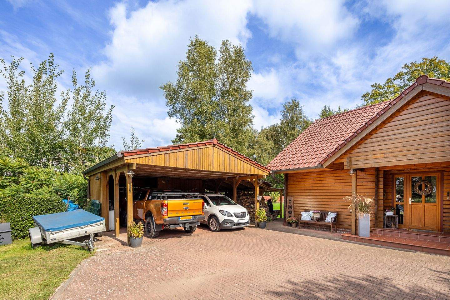 Dieses Merlin-Holzhaus aus dem Jahr 2004 bietet viel Platz und eine tolle Wohnatmosphäre. Es überzeugt durch einen durchdachten und komfortablen Grundriss. Der Flur und die darin integrierte offene Küche bilden das Herzstück des Hauses und verbinden die verschiedenen Bereiche auf ideale Weise. Angrenzend an die Küche befinden sich ein Wirtschaftsraum und der direkte Zugang zur Terrasse. Vom Flurbereich, vorbei am Hauptbadezimmer, gelangt man in den Wohnbereich mit Kaminecke und großzügigem Essbereich. Einen weiteren Bereich zu Linken bilden zwei Schlafzimmer und ein kleinerer Wohnraum, welcher sich ebenfalls als Schlafzimmer oder Büro eignet.Am Eingangsbereich befindet sich zudem ein weiteres Zimmer, das sich optimal als Gästezimmer nutzen lässt, zusammen mit dem kleinen Gäste-WC - beides vom Eingang aus zugänglich.Im Obergeschoss liegen der Heizungsraum, eine nicht beplankte Bodenfläche und ein weiteres Zimmer inklusive eines kleinen Abstellbereichs. Hier ließe sich prima ein Hobby- oder Teenie Zimmer einrichten. Besonders schön, sind die Fenster vom Flur zum Wohnbereich, die den Blick in den offenen Raum ermöglichen.Der Garten selbst ist groß und pflegeleicht gestaltet. Er bietet Platz für Spielmöglichkeiten, Sitzplätze oder auch einen eigenen Gemüsegarten. Das vorhanden Doppelcarport hat einen integrierten Abstellraum und eine Überdachung zur Lagerung des Feuerholzes für den Kamin.Hier erwartet Sie ein Eigenheim voller Gemütlichkeit und Charme in einer ruhigen ländlichen Umgebung.