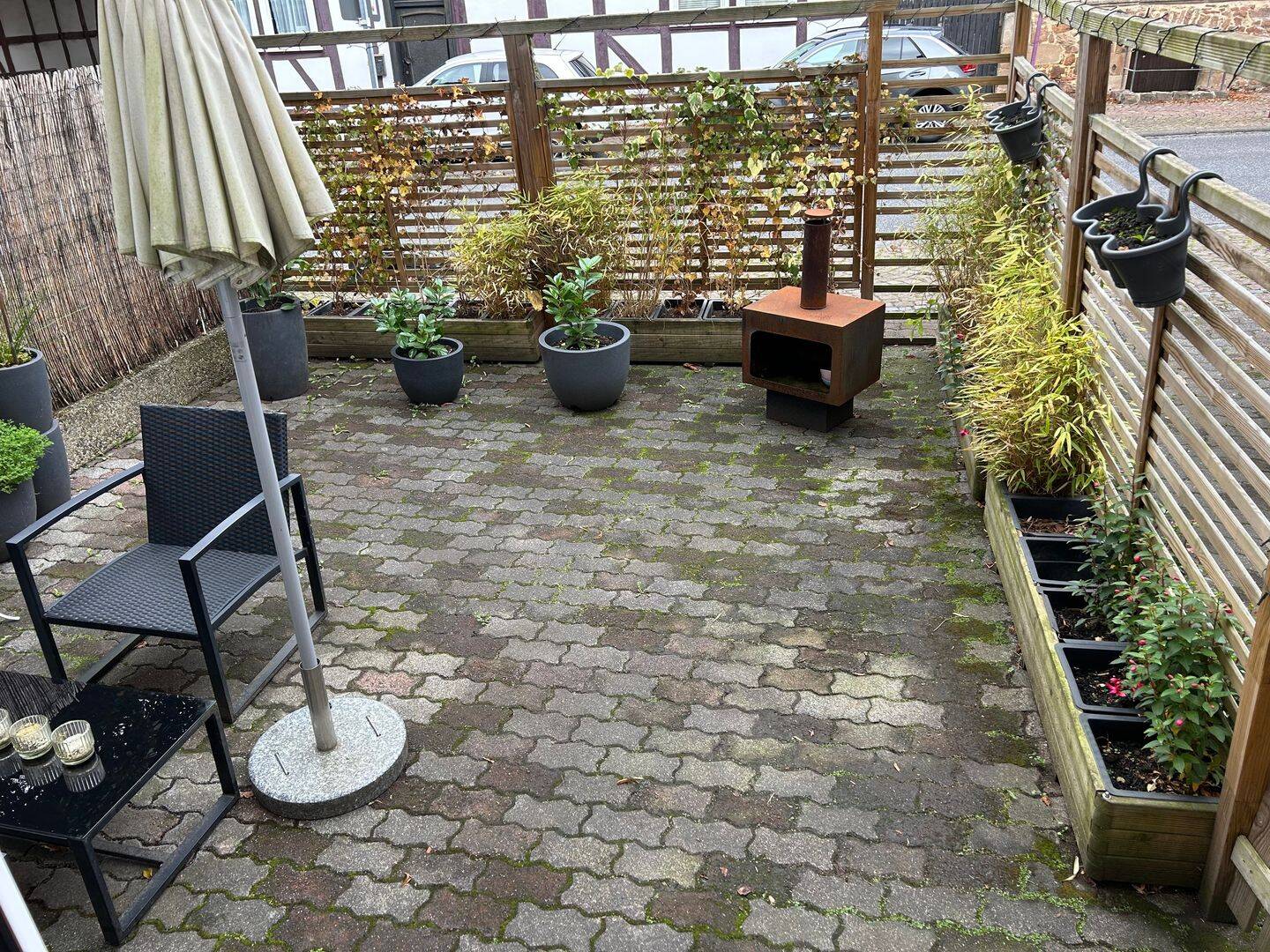 Ein Stellplatz direkt vor der Tür kann für 25 Euro monatlich mitgemietet werden. Direkt vor der Tür gibt es eine Terrasse, die zur Wohnung gehört und frei gestaltet werden kann.