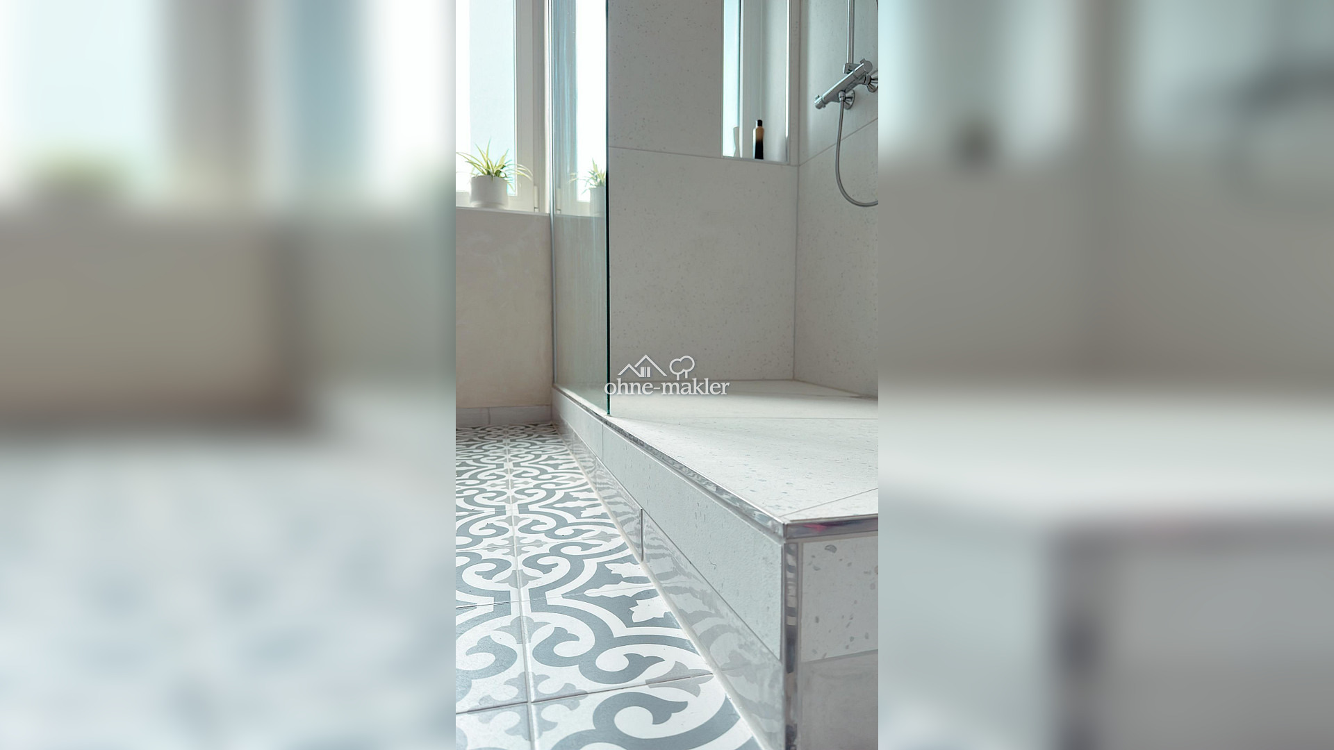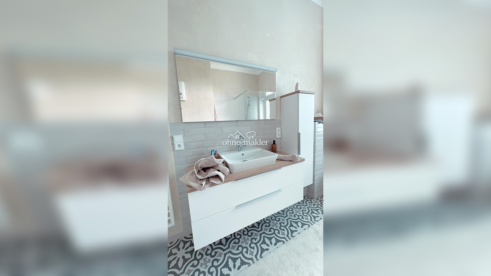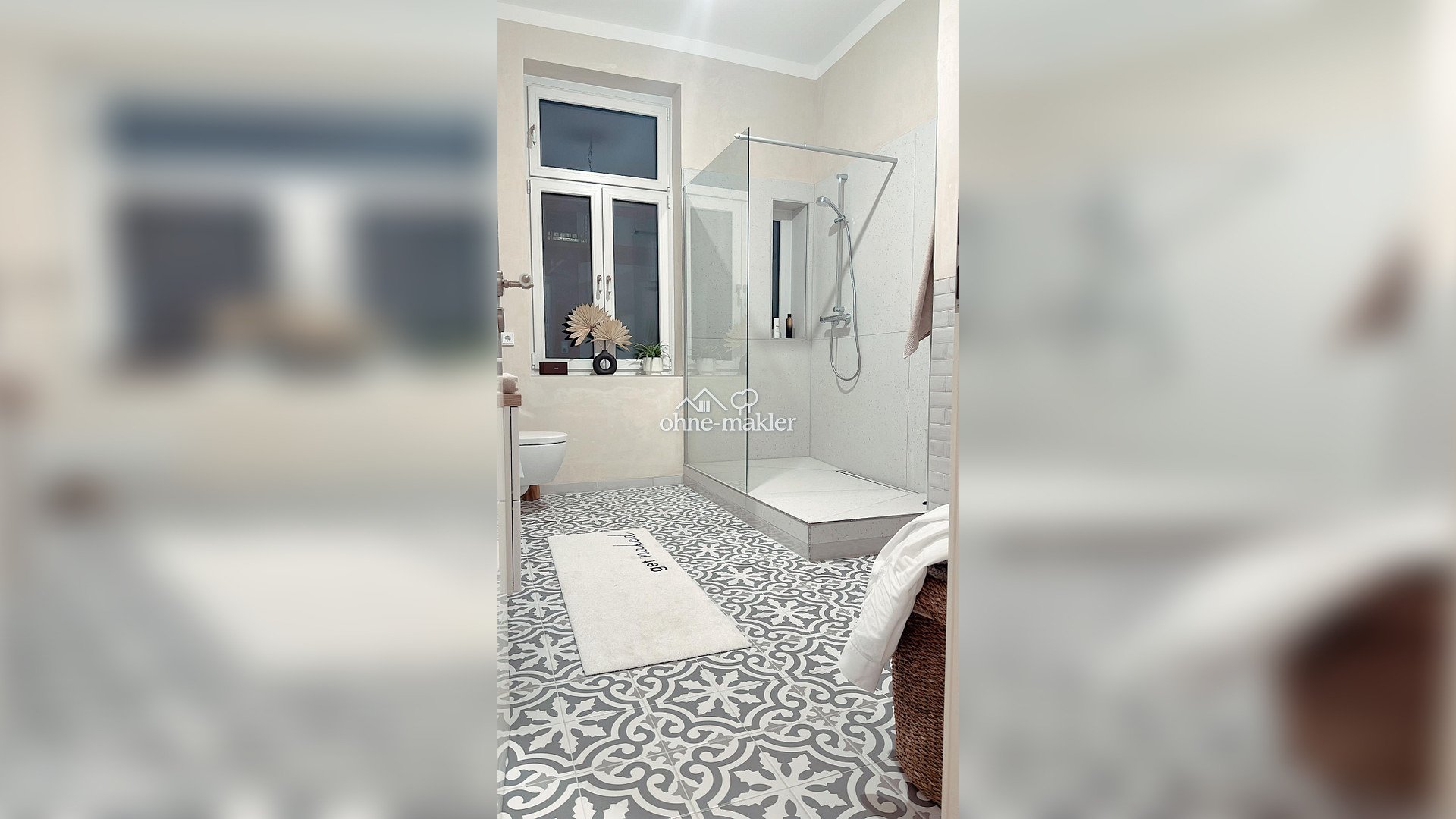 - neues hochwertig ausgestattetes Tageslichtbad mit 190 x 110 cm großer begehbarer Dusche, Glasduschabtrennung, Waschtisch mit Schubladen, Friedrich Grohe Armatur Essende, weiterer Badschrank mit Glasfächern, edle eingeputzte Fliesen (120x120 in Dusche, Brickfliesen über dem Waschtisch, beleuchteter Spiegel, Handtuchhalterheizkörper, , Waschmaschinenanschluss