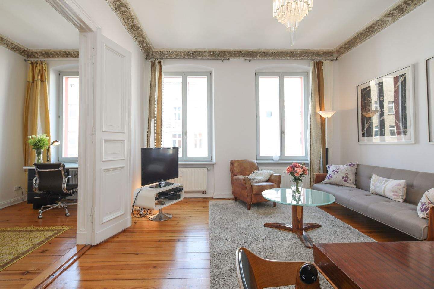[URL="https://wunderflats.com/de/l/5cd70a5176d1a3000664c0f5?utm_source=immowelt.de&utm_medium=partner&utm_campaign=demand&utm_content=DE"]Eine vollständige Beschreibung finden Sie bei wunderflats.com[/URL][URL="https://wunderflats.com/en/l/5cd70a5176d1a3000664c0f5?utm_source=immowelt.de&utm_medium=referral&utm_campaign=standard"]Click here for a detailed description of the apartment in English.[/URL] Wunderschöne moderne und sonnige 3 Zimmer Altbauwohnung mit Stuckdecken in Berlin Mitte, in einer perfekten Mischung aus Designermöbeln, Retro und Design Antiquitäten.Das Wohn,- Esszimmer ist ausgestattet mit einem Schlafsofa (für eine Person), gemütlichen Ledersessel, Couchtisch, Flat Screen TV und einem wunderbaren großzügigem Holzesstisch mit 4 Philippe Starck Stühlen.Der antike Kaminofen ist Dekoration.Durch die große Flügeltür kommen Sie zum Arbeits,- und Lesezimmer mit einem Bauhaus Schreibtisch und Philippe Starck Schreibtischstul.Das Schlafzimmer ist mit Doppelbett 180x200, 2 Nachttischen mit Leselampen und einem großzügigem Kleiderschrank eingerichtet. Die Fenster sind verdunkelbar. In der separaten voll ausgestatteten Einbauküche befindet sich noch ein separater Frühstückstisch für 2 Personen.Die gesamte Wohnung verfügt über einen Holzdielenboden.Die U-Bahn Station Schwartzkopffstr. mit der U6 ist fussläufug in 3 Minuten erreichbar und bringt Sie mit wenigen Stationen zum S Bahnhof Friedrichstraße, oder auch zum Potsdamer PlatzDie Wohnung liegt gleich bei der Chaussestraße und Sie erreichen sowohl den BND als auch das Naturkundemuseum in wenigen SchrittenÄhnliche Angebote