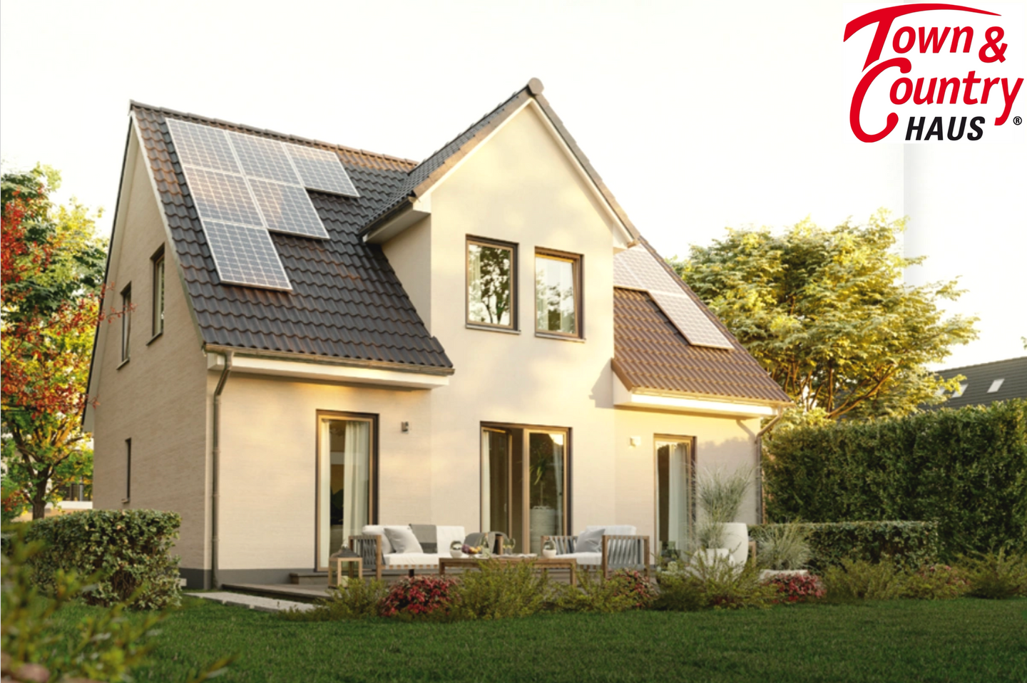 Im Dachgeschoss stehen die privaten Rückzugsbereiche zur Verfügung – mit Schlafzimmer, Kinderzimmer, Bad sowie Flur. Technisch ist das Haus als Town & Country Massivhaus u. a. mit Luft-Wasser-Wärmepumpe und Fußbodenheizung (in den Wohnräumen) geplant; moderne Fenster mit 3-fach Wärmeschutzverglasung und Rollläden runden das Gesamtpaket ab.