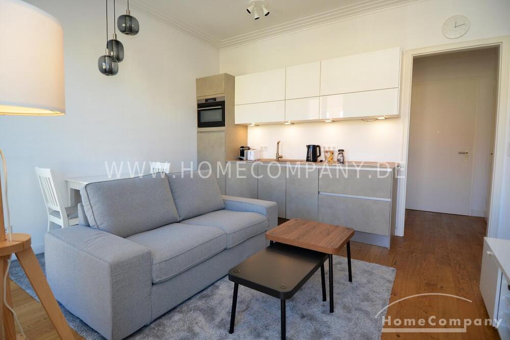 AG149129 Anspruchsvolles Wohnen in Berlin, die 1,5-Zimmer Wohnung liegt im 4. Obergeschoss eines im Jahre 2018 errichteten Wohnhauses. Mehrfarbige Natursteinböden, holzvertäfelte Wandfelder und angenehme Leuchten wecken Erinnerungen an elegante Stadtresidenzen früherer Zeiten. Die moderne Wohnung ist dank der bodentiefen Fenster sehr hell. Sie ist mit hochwertigen Parkettböden und Fußbodenheizung ausgestattet. Im Eingangsbereich befindet sich ein separater Raum, hier findet sich auch Platz für die Garderobe und die täglichen Dinge des Lebens. Der helle Wohnraum mit der integrierten und hochwertigen Einbauküche sowie Zugang zum Balkon bildet den Mittelpunkt der Wohnung. Das hochwertige Duschbad ist zeitgemäß mit großen Fliesen und einer ebenerdig begehbaren Dusche ausgestattet. Zur Wohnung gehören ein eigener Kellerraum und ein Pkw-Stellplatz in der Tiefgarage. Ausstattungsmerkmale der Wohnung im Überblick: - moderne und hochwertige Einbauküchenzeile - Duschbad mit ebenerdiger Dusche - bodentiefe Fenster mit elektrischen Jalousien - Fußbodenheizung, - Parkett, - Video-Gegensprechanlage, - Balkon, - Aufzug - Kellerraum, - Tiefgaragenstellplatz (für 110€/Monat) Bilder und Balkonmöbel werden noch ergänzt. 360 Grad Fotos: https://tour.feelestate.com/view/portal/id/VZFMR Angaben zum Energieausweis nach § 16a EnEV 2014: Energieausweis: Energieverbrauchsausweis, Endenergieverbrauch: 53,2 kWh (m²a), wesentlicher Energieträger: Fernwärme, Baujahr: 2018 Balkon gemütlich Herd Einbauküche Parkett PKW Stellplatz Zentralheizung Tisch/Schreibtisch Internet zzBilder vorh. Bett Kabel/Sat TV Küche Kühlschrank offene Küche Spülmaschine Waschmasch. Garage Fliesen Couch/SchlafcouchImpressum des Anbieters: