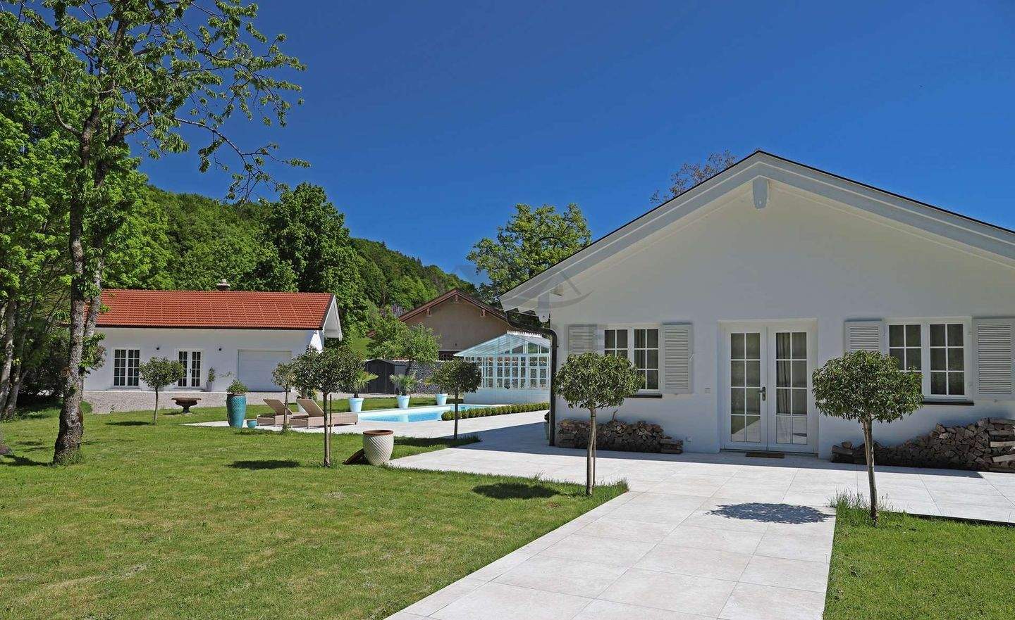 Exklusive Zweier Bungalow-Residenz in idyllischer Lage - Zwei Einheiten mit Pool auf großzügigem Grundstück im ChiemgauDiese außergewöhnliche Bungalow-Anlage vereint modernen Wohnkomfort mit alpinem Charme und liegt in absolut ruhiger, uneinsehbarer Lage im idyllischen Siegsdorfer Ortsteil Heutau - eingebettet in die weitläufige Naturkulisse des Chiemgaus. Die Immobilie, bestehend aus zwei freistehenden Bungalows auf einem beeindruckenden, ca. 8.338 m² großen Grundstück, wurde erst 2023 errichtet und präsentiert sich in neuwertigem Zustand.Mit einer kombinierten Wohnfläche von ca. 220 m², drei stilvoll gestalteten Schlafzimmern, zwei eleganten Bädern sowie zwei separaten WC's bietet dieses Objekt vielseitige Nutzungsmöglichkeiten - ob als großzügiges Familiendomizil, als Mehrgenerationenlösung oder zur Kombination von Wohnen und Arbeiten. Die beiden Gebäude haben eine separate Heizung und können problemlos unabhängig voneinander betrieben werden. Ein Bungalow verfügt über eine Gas-Heizung, das andere über eine moderne Wärmepumpe.Ein besonderes optisches Highlight bildet der geschmackvoll überdachte Freisitz - ein Ort der Entspannung und Geselligkeit, der sich harmonisch in das naturnahe Ambiente einfügt. Der angrenzende Pool ergänzt das Lebensgefühl von Ruhe und Erholung und macht den Außenbereich zur privaten Wohlfühloase.Im Inneren überzeugt vor allem einer der beiden Bungalows durch äußerst gehobene Ausstattung: Eine moderne Einbauküche und ein stilvoll integrierter Kamin sorgen für ein wohnliches Ambiente mit besonderem Charakter. Die durchdachte Raumaufteilung wird durch zahlreiche doppelflügelige Fenster ergänzt, die eine angenehme Lichtdurchflutung gewährleisten und reizvolle Ausblicke auf das umliegende Grün eröffnen.Diese besondere Immobilie eignet sich ideal für Menschen mit einem hohen Anspruch an Privatsphäre, Stil und Naturverbundenheit. Die Kombination aus hochwertiger Bauweise, architektonischer Klarheit und der traumhaften Lage im Herzen des Chiemgaus macht dieses Anwesen zu einem echten Juwel.