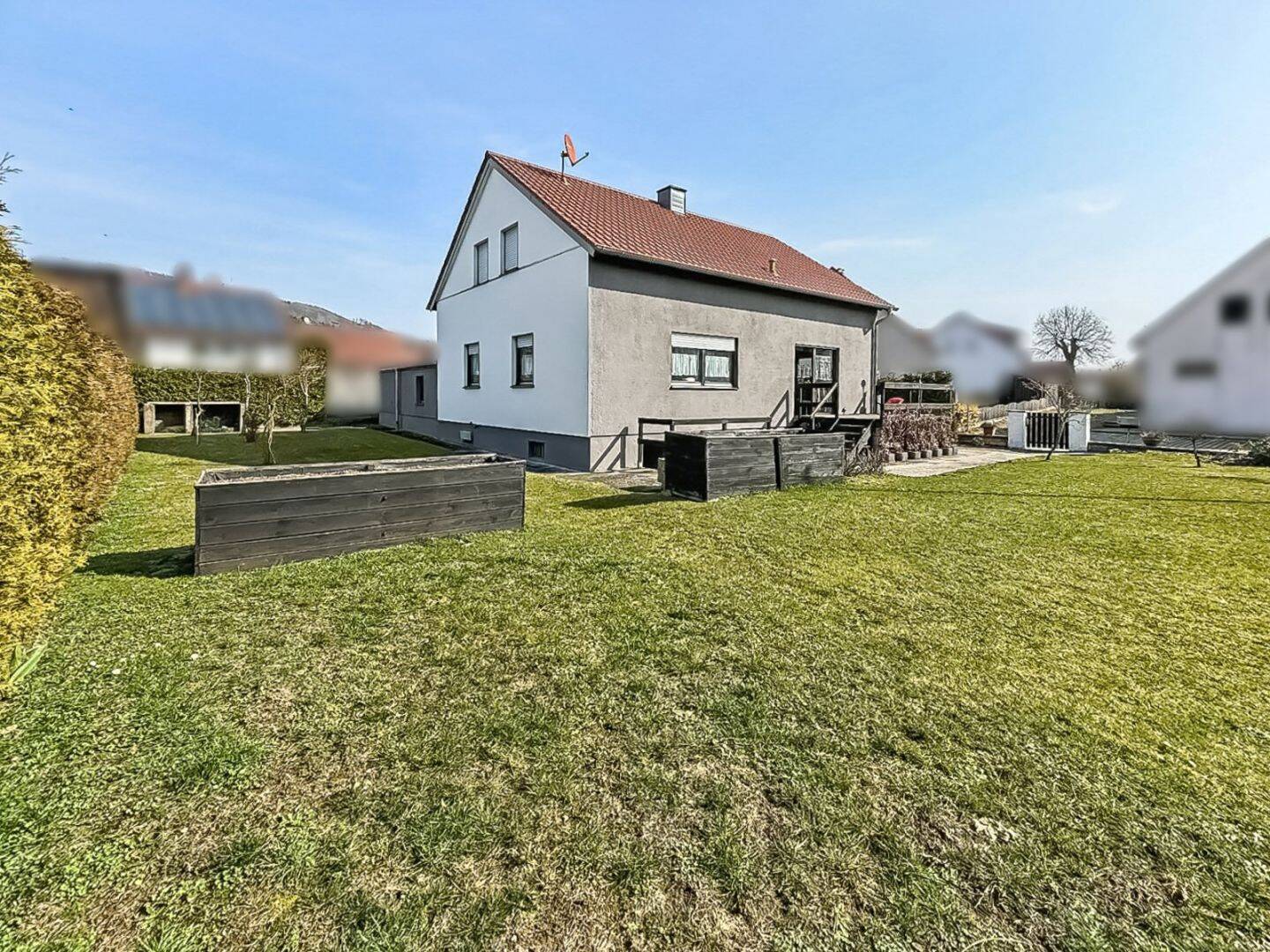 Die angebotene Immobilie wird im Sale & Lease-Back-Verfahren verkauft. Das heißt, der Verkäufer bleibt als Mieter. Als Käufer erhält man dafür monatliche Mieteinnahmen in Höhe von ca. 1.400 EUR monatlich zzgl. Nebenkosten.Dieses Einfamilienhaus bietet mit ca. 131 m² Wohnfläche genügend Platz für die ganze Familie. Im Erdgeschoss befinden sich ein gemütlicher, heller Wohnbereich sowie die moderne, offene Wohnküche. Hier finden ebenso ein Schlafzimmer (auch als Arbeitszimmer geeignet), das geflieste Badezimmer und ein Gäste-WC Platz. Eine helle Natursteintreppe führt ins ausgebaute Dachgeschoss. Hier sind drei weitere Zimmer, die je nach individuellen Bedürfnissen als Schlafzimmer, Kinderzimmer oder Büro genutzt werden können.Die Beheizung der Immobilie erfolgt über eine Öl-Zentralheizung. Die Immobilie befindet sich in einem sehr gepflegten Zustand und wurde laufend instandgehalten. Fenster und Dach stammen ca. aus 2015. Die Wasserleitungen wurden ca. 2020 bei der Badsanierung teilweise mit erneuert. Die Fassade bekam ca. 2022 einen neuen Anstrich.Auf dem Grundstück stehen außerdem eine Garage und ein Carport für zwei PKWs zur Verfügung.