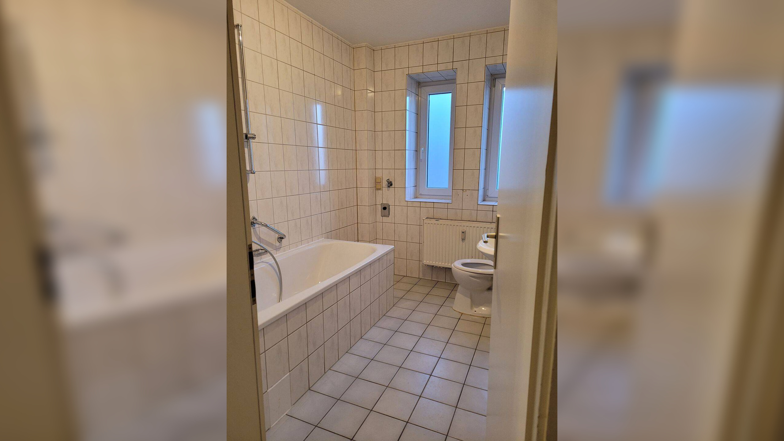 Modernisiertes Wannenbad mit blickdichten Fenstern, vollständig gefliest