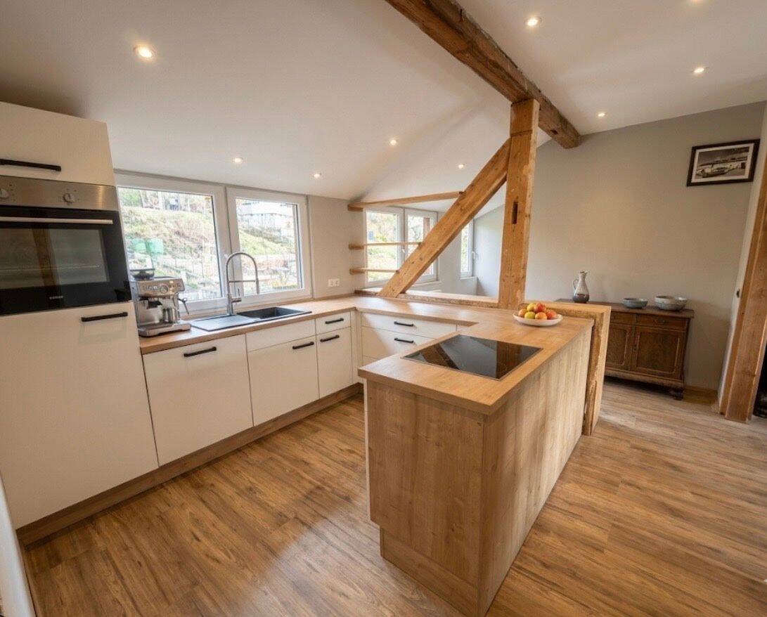 Großzügige und energetisch vollsanierte 4-Zimmer-Wohnung mit ca. 150 m² Wohnfläche. Der Zugang zur Wohnebene erfolgt über ein separates Treppenhaus, was der Immobilie einen ungestörten Haus-in-Haus-Charakter verleiht. Die Wohnräume zeichnen sich durch freigelegte Holzbalken, einen durchgängigen Bodenbelag in Holzoptik und eine hervorragende natürliche Belichtung durch beidseitige Fensterfronten und Dachgauben aus.