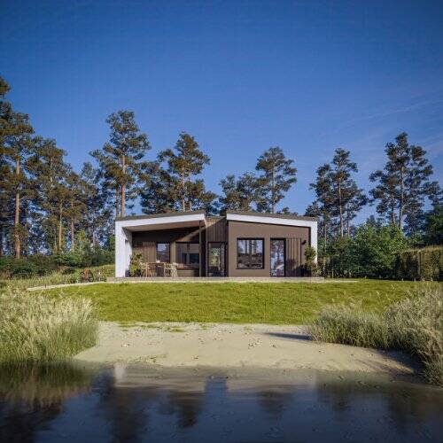 Tiny Houses sind eine interessante Alternative zum klassischen Einfamilienhaus. Hinter dem Konzept steckt eine bewusste Lebenseinstellung. Meist geht es darum, das eigene Leben zu vereinfachen und sich von überflüssigem Ballast zu trennen: Weniger Besitz bedeutet weniger Arbeit und auch weniger Kosten. Wer sich für ein kleines Haus wie den Bungalow COMPACT 56 entscheidet, der erleichtert sich zudem die Suche nacheinem passenden Bauplatz. Dank der geringen Grundfläche von gerade einmal 75 m² findet das Fertighaus selbst in kleineren Baulücken oder auf schwierig geschnittenen Grundstücken Platz. Es spricht aber auch nichts gegen einen großen Garten. Vor allem Familien werden den zusätzlichen Lebensraum zu schätzen wissen.Das äußere Erscheinungsbild wird geprägt von einer modernen Formensprache und attraktiven Details.Blickfang sind die versetzten Fassaden auf der Eingangs- und der Gartenseite. Sie lassen außen geschützte Bereiche entstehen, die für ein Plus an Privatsphäre sorgen. Eine interessante Tiefenwirkung erzielen die grau abgesetzten Fassadenbereiche.Das Innere des Bungalows bietet auf einer Wohnfläche von knapp 56 m² ausreichend Platz für Singles, Paare und Familien mit einem Kind. Die Grundrissaufteilung basiert auf mehreren Jahrzehnten Erfahrung im Hausbau.Zugunsten der Wohnräume wurden die Verkehrswege auf ein Minimum reduziert. Als Verteiler zwischen den Räumen fungiert eine kompakte Diele mit Garderobennische. Links schließt sich das Bad mit Dusche und Zugang zum Technikraum an. Letzterer bietet nicht nur Platz für die Heizungsanlage, sondern auch für Waschmaschineund Trockner. Rechts der Diele liegt das Elternschlafzimmer, an das ein kleines Büro angedockt wurde. Durch das Fenster ist es auch hier hell und gemütlich. Alternativ kann der Raum auch als Ankleidegenutzt werden. Im hinteren Bereich des Bungalows befinden sich die offen angelegten Gemeinschaftsräume sowie das Kinderzimmer. Beide bieten Zugang zur überdachten Terrasse, die zum Entspannen unter freiem Himmel einlädt.