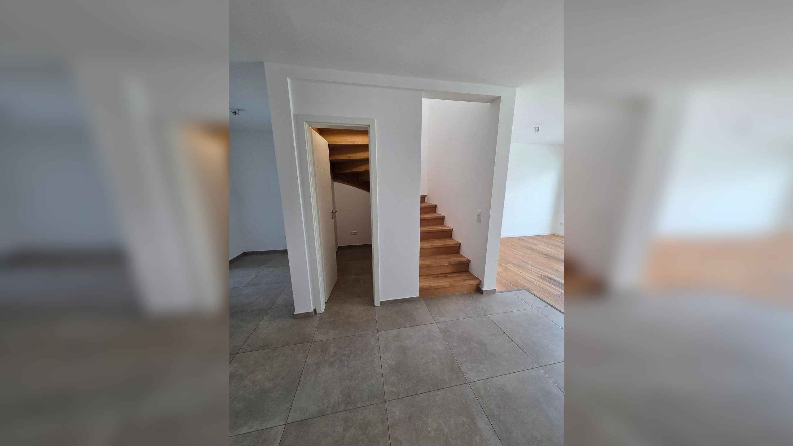Die beiden Außenstellplätze der Maisonettewohnung befinden sich direkt gegenüber vom Hauseingang. Betreten wird die Wohnung über einen eigenen Aufgang. Der helle Windfang bietet Platz für eine Garderobe. Die Verteilerkästen für Elektrik und Internet befindet sich ebenso wie die Verteilung der Fußbodenheizung im Windfang. Der Windfang ist mit geschmackvollen und hochwertigen Fliesen ausgestattet.