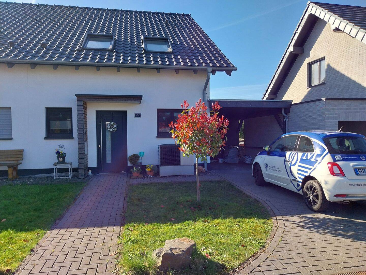 Die Innenaufnahmen stammen noch aus der Rohbauphase, da die Immobilie derzeit vermietet ist.Diese ansprechende und moderne Doppelhaushälfte aus dem Baujahr 2020 überzeugt durch eine durchdachte Raumaufteilung, hochwertige Ausstattungsmerkmale sowie ein angenehmes Wohnambiente. Die Immobilie eignet sich ideal für Paare, Familien oder auch für Wohnen und Arbeiten unter einem Dach.Im Erdgeschoss empfängt Sie ein einladender Flur, von dem aus alle Räume bequem erreichbar sind. Neben einem praktischen Abstellraum stehen Ihnen ein Vorratsraum zur Verfügung. Der Abstellraum bietet zudem ausreichend Platz sowie die entsprechenden Anschlüsse für Waschmaschine und Trockner. Ein Gäste-WC mit Dusche sorgt für zusätzlichen Komfort. Der helle Wohn- und Essbereich mit direktem Zugang zur großen Terrasse und dem Garten bildet das Herzstück des Hauses. Die Ausrichtung nach Osten und Süden ermöglicht eine optimale Belichtung über den gesamten Tag hinweg. Über die Treppe gelangen Sie in das Obergeschoss, das flexibel genutzt werden kann. Hier stehen Ihnen insgesamt drei Zimmer zur Verfügung, die sich ideal als Schlafzimmer, Kinderzimmer oder Büro eignen. Das moderne Badezimmer ist mit sowohl einer Dusche als auch einer Badewanne ausgestattet und bietet somit hohen Wohnkomfort.Die Ausstattung umfasst pflegeleichte Fliesenböden in Flur, Küche und Badezimmern, während Wohn- und Schlafräume mit hochwertigem Parkettboden versehen sind, der für eine warme und wohnliche Atmosphäre sorgt. Beheizt wird die Immobilie über eine energieeffiziente Luft-Wärmepumpe, die zeitgemäßes und nachhaltiges Wohnen unterstützt.Abgerundet wird dieses attraktive Angebot durch einen Carport sowie einen zusätzlichen Stellplatz direkt am Haus.Diese moderne Doppelhaushälfte vereint zeitgemäßes Wohnen mit funktionaler Raumaufteilung und bietet ein ideales Zuhause in angenehmer Wohnlage.