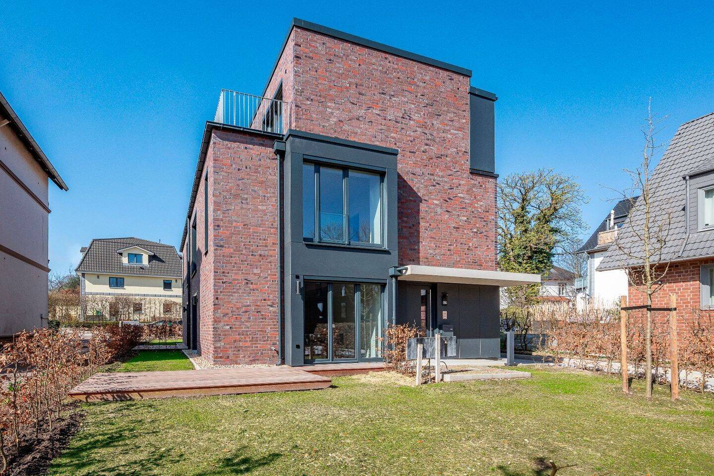 Modernes Stadthauswohnen in ruhiger Lage: Dieses hochwertige Neubau Townhouse überzeugt mit klarer Architektur, großzügigen Fensterflächen und einem besonderen Highlight - die direkte Nähe an das angrenzende Naturidyll. Die Umgebung schafft ein außergewöhnlich ruhiges Wohngefühl und macht das Haus besonders attraktiv für Familien.Bereits im Erdgeschoss entfaltet sich der großzügige Wohn- und Essbereich als zentraler Lebensmittelpunkt des Hauses. Große, bodentiefe Fenster öffnen sich zur Südterrasse. Innen- und Außenbereich gehen fließend ineinander über, während die naturnahe Umgebung für eine besondere Wohnatmosphäre sorgt. Die offene Küche fügt sich harmonisch in den Wohnbereich ein und schafft einen kommunikativen Familienraum.Im Obergeschoss befinden sich zwei gut geschnittene Zimmer, die sich ideal als Kinderzimmer oder Arbeitszimmer nutzen lassen. Ein komfortables Familienbad sowie praktische Abstellflächen sorgen für einen funktionalen und familienfreundlichen Grundriss.Das Dachgeschoss bildet den privaten Elternbereich. Das großzügige Schlafzimmer mit Bad en Suite und Zugang zur weiteren Außenfläche schafft einen ruhigen Rückzugsort mit viel Privatsphäre. Auch hier sorgen große Fenster für ein helles, freundliches Ambiente.Die moderne Architektur mit hochwertiger Klinkerfassade, klaren Linien und großzügigen Fensterflächen unterstreicht den zeitgemäßen Charakter des Hauses. Zwei Außenbereiche, die ruhige Lage am Biotop sowie die durchdachte Aufteilung über drei Ebenen verleihen dieser Immobilie eine besondere Wohnqualität.Ein ideales Zuhause für alle, die naturnah wohnen und gleichzeitig die Vorzüge der Elbvororte genießen möchten.Die Ausstattungsdetails auf einen Blick: Nach Süden ausgerichtete Terrasse und DachterrasseTerrasse mit elektrischem SonnenmarkisenanschlussBodentiefe Fenster für lichtdurchflutete RäumeDreifach verglaste HolzfensterAbschließbare FenstergriffeEichenparkett, LandhausdielenDornbracht ArmaturenGroßformatige Fliesen, bodengleiche DuschenFußbodenheizung mit EinzelraumsteuerungVerbundsicherheitsglas im EGKontrollierte Be- und Entlüftung mit WärmerückgewinnungGegensprechanlage, Vorrüstung für eine AlarmanlageLuft-Wärme-Pumpe und Photovoltaikanlage Außenstellplatz zusätzlich erwerbbarFertigstellt und bezugsfertig