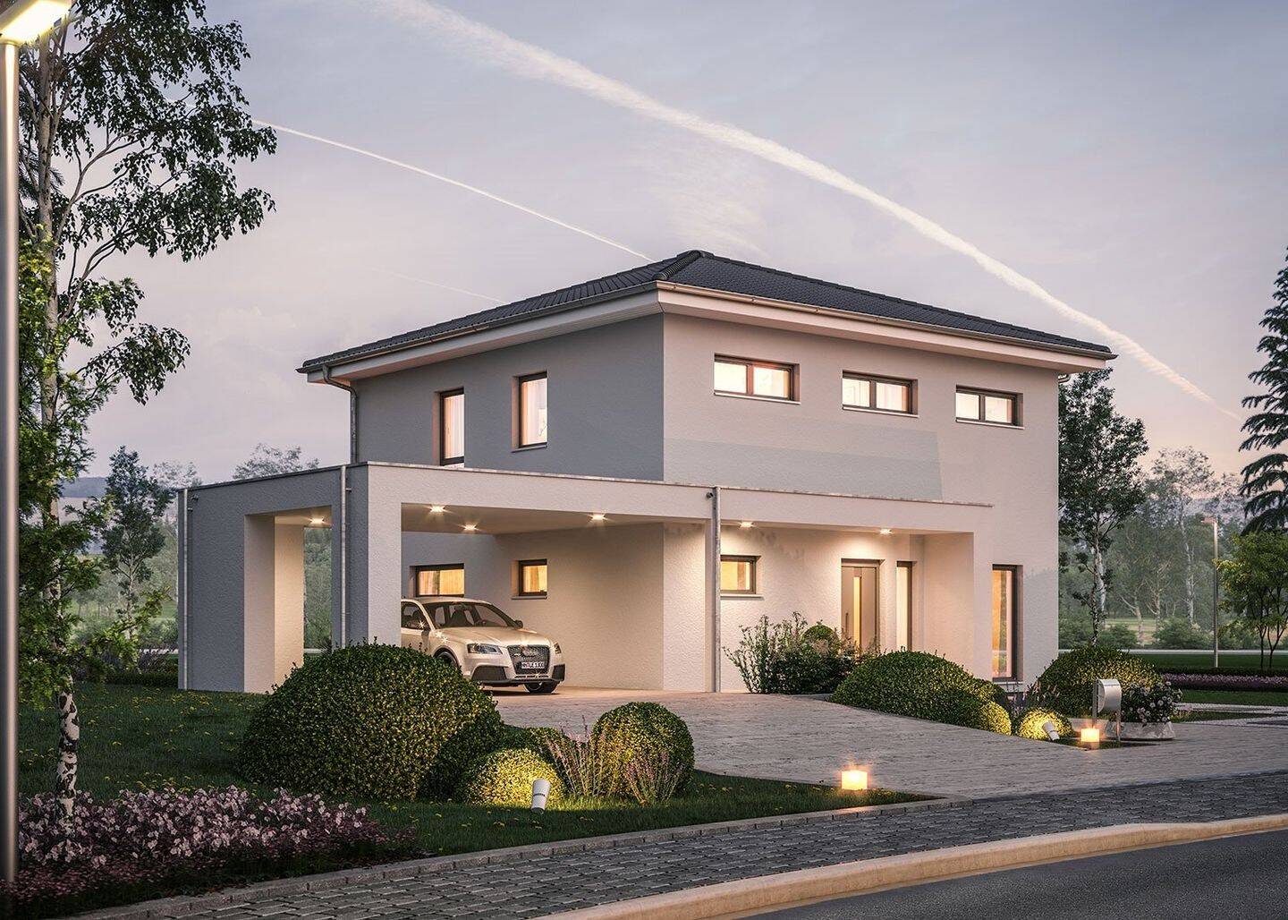 Diese Stadtvilla mit ca. 162 m² Netto-Grundfläche (nach DIN277) spricht mit seinem mediterranen, aber doch modernem Flair einfach für sich!Die Luft-Wasser-Wärmepumpe mit der Belüftungsanlage sorgt für angenehmes Raumklima.Das Elternschlafzimmer im EG, mit seinem eigenen Duschbad hat seinen besonderen Charm. Das Dachgeschoss können Sie dann Ihren Kindern überlassen.Gerne passen wir den Grundriss, aber auch die Hausgröße Ihren Bedürfnissen an. Anbauteile wie Erker, Balkone, Zwerchgiebel, Wintergärten, Garagen usw. sind natürlich auch möglich, um Ihrem Haus noch mehr Flair zu geben. Sprechen Sie mich hierzu an! Die überdachte Terrasse bietet an Sonnentagen Schatten, und bei Regen Schutz. Noch mehr Platz bekommen Sie, wenn wir Ihnen auch einen Keller anbieten. Ihre Grundfläche vergrößern Sie dann entsprechend. Bei unserer Raumhöhe von 2,75 m empfinden Sie das Wohnen ganz anders. Diese Raumhöhe ermöglicht nicht nur eine wunderbare Behaglichkeit, sondern macht es auch möglich, dass unsere Terrassentüren und Fenster höher ausgeführt werden können. Der zusätzliche Lichteinfall begeistert all unsere Kunden! Das Effizienzhaus 55 ist bei uns Standard. Das Effizienzhaus 40 und 40 Plus sind natürlich auch möglich!