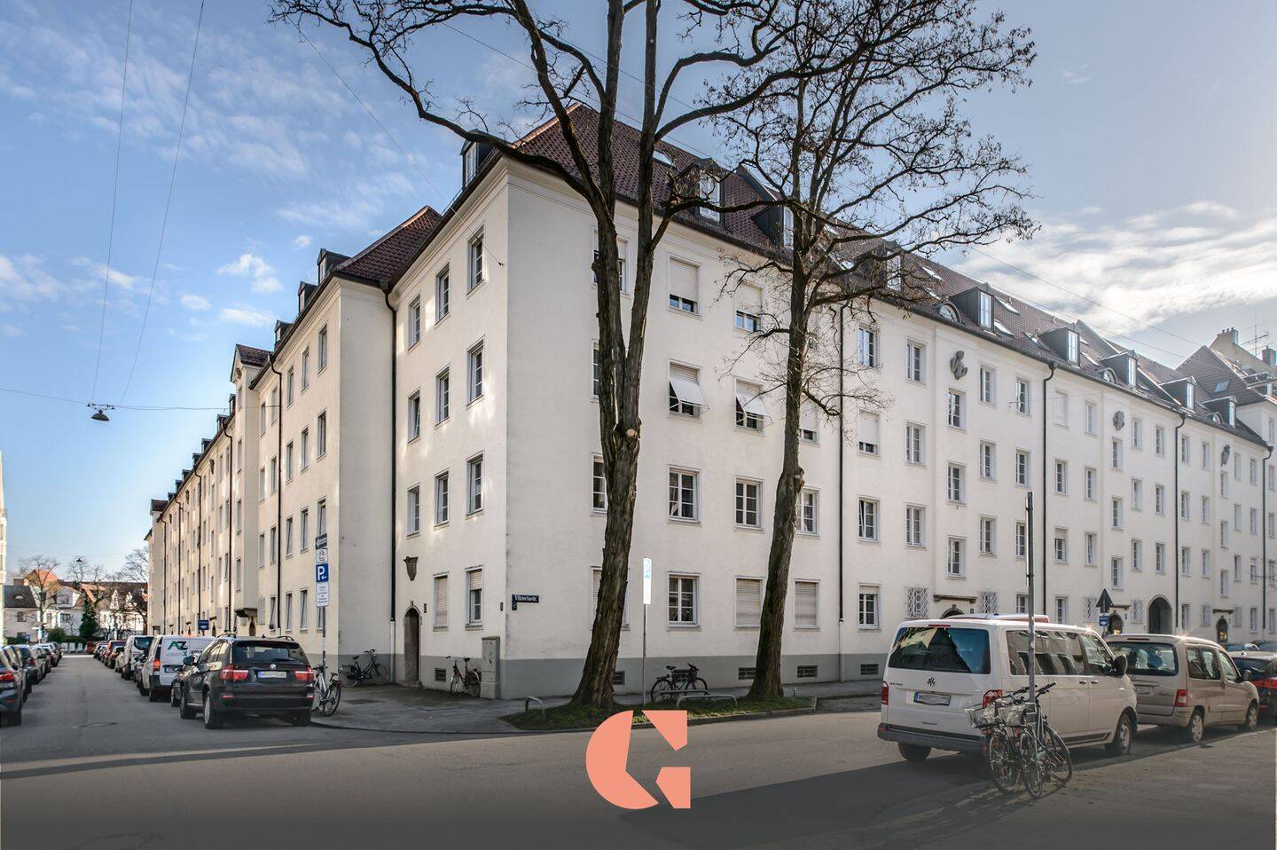 Diese attraktive Wohnung befindet sich im 1. Obergeschoss eines gepflegten Gebäudes aus dem Baujahr 1925 und bietet eine Wohnfläche von ca. 88 m², verteilt auf drei Zimmer.Die Immobilie überzeugt nicht nur durch ihre zentrale Lage in München, sondern auch durch typische Altbau-Elemente wie eine angenehme Deckenhöhe von etwa 2,70 m. Ein besonderes Highlight ist die nach Osten ausgerichtete Loggia, die von der Küche aus zugänglich ist und sich ideal für ein Frühstück in der Morgensonne eignet.Beim Eintreten in die Wohnung gelangen Sie in einen großzügigen, quadratischen Flur. Auf der linken Seite befinden sich das Badezimmer mit Badewanne, ein separates WC sowie die Küche. Diese ist mit einer hochwertigen Einbauküche inklusive Granitarbeitsplatte und Spülmaschine ausgestattet. Direkt angrenzend liegt eine praktische Speisekammer mit Außenlüftung.Die rechte Seite des Flures führt zu den Wohnräumen: ein geräumiges Wohnzimmer, ein weiteres Zimmer, das sich ideal als Arbeits- oder Kinderzimmer eignet, sowie ein Schlafzimmer. Alle Räume sind nach Westen ausgerichtet und profitieren von der Abendsonne. Zudem sind sie mit gepflegtem, aufgearbeitetem Parkettboden ausgestattet.Im Zuge von Renovierungsmaßnahmen vor etwa acht Jahren wurden unter anderem die Holzfenster, die Heizungsanlage sowie die Klingelanlage erneuert. Auch die Elektrik und Wandoberflächen wurden modernisiert, und das originale Parkett in den Wohnräumen wurde abgeschliffen. Darüber hinaus verfügt das Gebäude über ein neues Dach, wodurch aktuell nur geringer Instandhaltungsbedarf besteht.Ein weitläufiger, parkähnlicher Gemeinschaftsgarten steht den Bewohnern zur Nutzung zur Verfügung.Zur Wohnung gehört außerdem ein großzügiger Kellerraum mit eigenem Anschluss für eine Waschmaschine. Sowohl im Keller als auch im Innenhof sind ausreichend Fahrradstellplätze vorhanden.