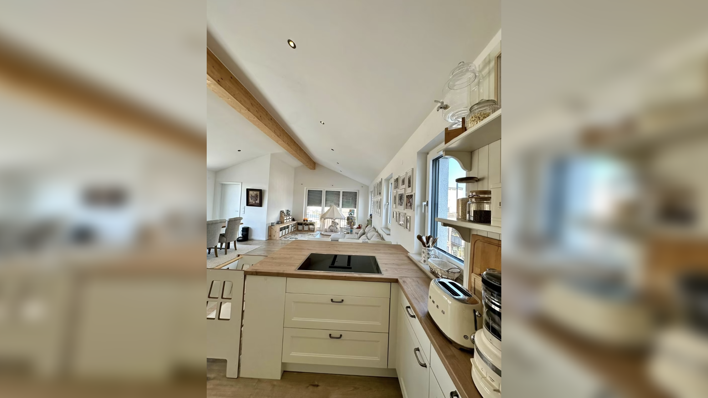 Die Dachterrasse ist das Herzstück: groß genug für Tisch, Stühle und Sonnenschirm, mit freiem Blick ins Grüne. An Sommerabenden werden Sie hier öfter sitzen als drinnen.