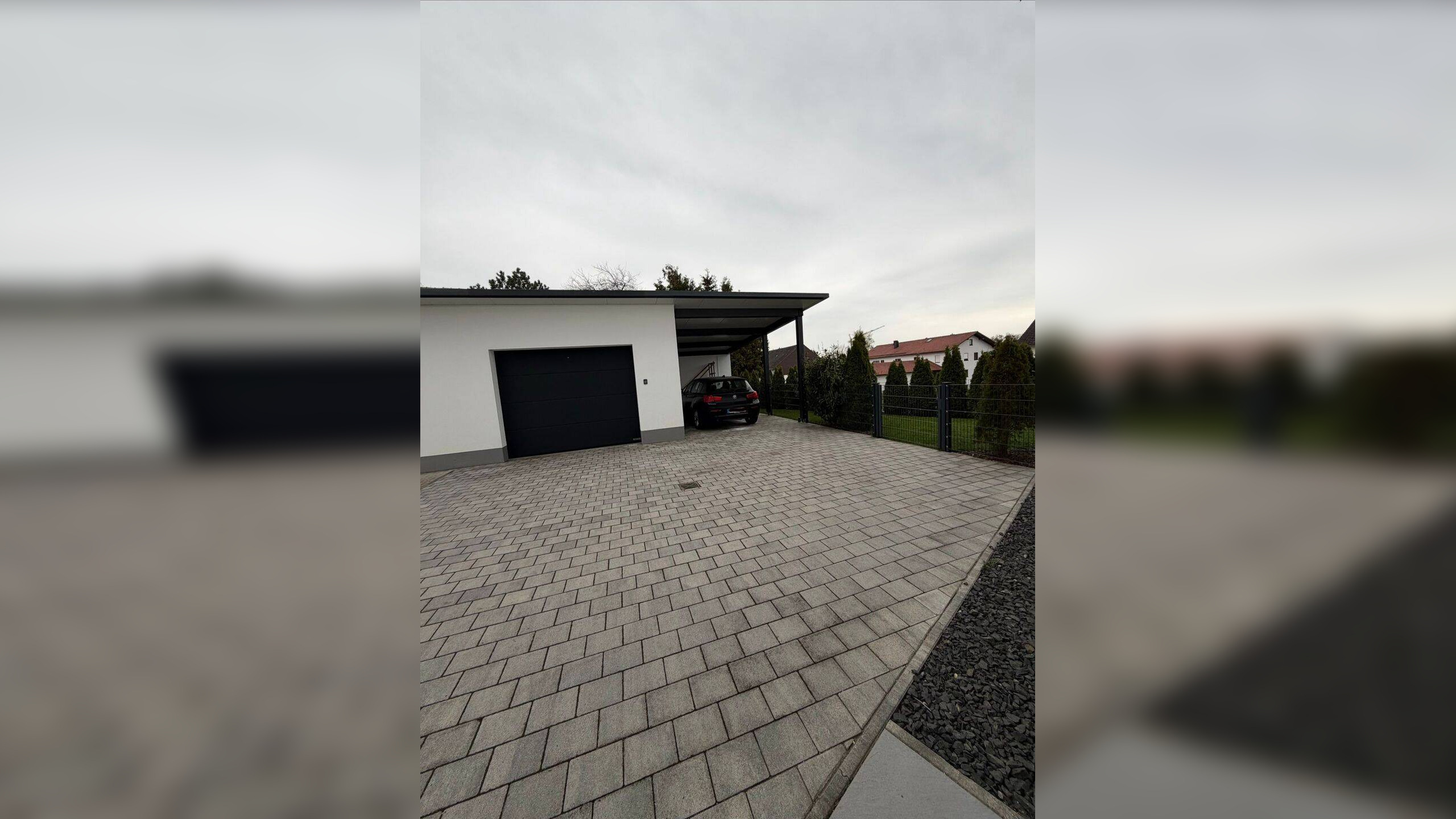 Zu dem Haus gehören eine 31 m² große Garage, ein Carport sowie zwei zusätzliche Stellplätze.