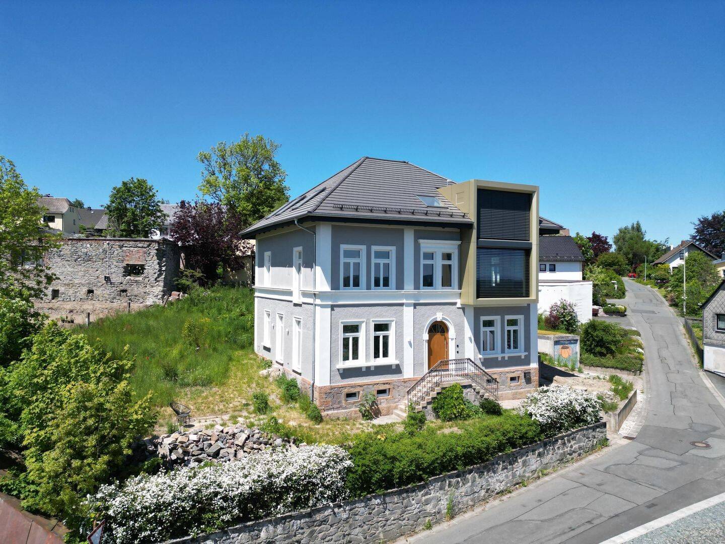 ObjektbeschreibungWohnen und arbeiten in einem Smart-Home von 1895!Ein unvergleichbares Objekt, das regional und überregional seinesgleichen sucht. Das alte Pfarrhaus wurde 2021 und 2022 aufwändig kernsaniert und umgebaut und genügt nunden neuesten Wohnstandards auf gehobenem Niveau. Als architektonisches Highlight wurde ein über 6m hoher und verglaster Kubus in die Fassade eingeschoben, welcher im1.OG und Dachgeschoss einen sagenhaften Weitblick über den Frankenwald eröffnet. Im Küchen-, Wohn- und Essbereich ergeben sich dadurch die verschiedensten Perspektivenin die Ferne, im Master-Schlafzimmer genießt man den Sonnenaufgang am Horizont. Die ebenfalls neu hergestellte über 6m hohe Glasfassade im Treppenhaus auf der Rückseitedes Hauses ermöglicht weitere Ausblicke und setzt die minimalistische und maximal transparente Stahl-Treppe gekonnt in Szene. Das Haus verbindet Historizität mit modernsterArchitektur. Die sorgfältig sanierte Fassade mit ihren Gewänden, Lisenen und den historisch korrekt ausgeführten dreiteiligen Holzfenstern harmoniert perfekt mit derScharfkantigkeit und der goldenen Alucobond-Oberfläche des eingeschobenen Kubus.Der Innenraum besticht mit kompromissloser Geradlinigkeit und Minimalismus: Flächenbündige Innentüren ohne sichtbare Zargen und Schlüsselrosetten, flächenbündigeSockelleisten, fugenlose Spachtelböden im EG und den Bädern und ein Beleuchtungskonzept, das auf viel indirektes Licht und ausgewählte Highlights setzt. So ziehen sich diesenkrechten und flächenbündig verbauten LED-Lichtleisten streng durch den maximal geradlinigen Flur im EG, um dann im Treppenhaus in eine lockere, asymmetrische und teilswillkürlich wirkende Anordnung überzugehen.