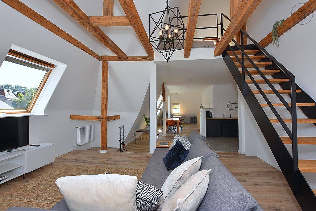 Exklusive, wunderschöne 1,5-Zimmer Maisonette-Loftwohnung mit Klimaanlage und fantastischem Blick im beliebten Stuttgart West.Das Haus liegt am Ende einer ruhigen Sackgasse. Einkaufsmöglichkeiten und vielfältige Gastronomie befinden sich in unmittelbarer Nachbarschaft. Zu öffentlichen Verkehrsmitteln wie U-Bahn, S-Bahn und Bus sind es nur wenige Gehminuten.Der sonnige, großzügige Wohn- und Essbereich mit offener Küche ist mit einem Ecksofa, einem Esstisch mit Platz für sechs Personen und einem Arbeitsbereich eingerichet.Hier befindet sich auch die offene Einbauküche mit kleinem Geschirrspüler.Auf der oberen Etage befindet sich der Schlafbereich mit Französischem Bett (140x200) und einem Kleiderschrank.Das Tageslichtbad verfügt über eine Badewanne. Hier befindet sich auch die Waschmachine. Die einmalige Endreinigungsgebühr beträgt 230,00 Euro.Internet (WLAN) und ein monatlicher Reinigungsservice sind in der Miete inbegriffen.Ein überdachter PKW-Stellplatz (ca. 100 Meter vom Haus entfernt) kann, je nach Verfügbarkeit, für monatlich 180,00 Euro angemietet werden. In der angegebenen Miete, welche für eine Person gilt, sind die Nebenkosten sowie eine Vorauszahlung für Strom und Gas in Höhe von 200,00 Euro bereits enthalten.Der Rundfunkbeitrag wird vom Mieter selbst angemeldet und bezahlt.Alle Angaben beruhen auf Auskünften des Eigentümers. Trotz unserer Gewissenhaftigkeit können wir für die Richtigkeit der Angaben keine Haftung übernehmen.Weitere möblierte Angebote finden Sie unter www.hc24.de.