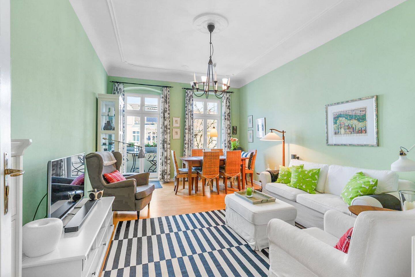 Diese gepflegte 2-Zimmer-Wohnung befindet sich im 3. Obergeschoss eines klassischen Berliner Gründerzeit-Altbaus aus dem Jahr 1910 und vereint historischen Charme mit modernem Wohnkomfort. Auf ca. 67 m² Wohnfläche bietet die Wohnung eine durchdachte Raumaufteilung und eine angenehme Wohnatmosphäre.Das Gebäude wurde im Jahr 1998 umfassend saniert und präsentiert sich in einem sehr gepflegten Zustand. Insgesamt umfasst die Wohnanlage 29 Einheiten, verteilt auf Vorderhaus und Gartenhaus. Im Innenhof stehen den Bewohnern teilweise überdachte Abstellmöglichkeiten für Fahrräder zur Verfügung.Der Wohnbereich ist nach Osten ausgerichtet und überzeugt durch seine Helligkeit sowie den direkten Zugang zum sonnigen Balkon. Hier lassen sich die Morgenstunden besonders angenehm genießen. Die Räume zum ruhigen Innenhof - darunter Schlafzimmer, Küche und Badezimmer - sind nach Westen ausgerichtet und bieten eine entspannte Rückzugssituation.Die Wohnung besticht durch klassische Altbaudetails wie Stuckelemente und sorgfältig verspachtelte Wände, die den stilvollen Charakter der Immobilie unterstreichen. Das Schlafzimmer verfügt über einen begehbaren Kleiderschrank, der praktischen Stauraum und zusätzlichen Komfort bietet.Die Einbauküche ist funktional ausgestattet und beinhaltet moderne Elektrogeräte, darunter ein Induktionskochfeld, eine Kühl- und Gefrierkombination sowie einen integrierten Waschtrockner. Sie fügt sich harmonisch in das Gesamtbild der Wohnung ein und ermöglicht eine komfortable Nutzung im Alltag.Das Tageslichtbad sorgt durch das Fenster für eine angenehme Belichtung und Belüftung und ergänzt das durchdachte Raumkonzept sinnvoll.Die Immobilie kann auf Wunsch möbliert übernommen werden, was einen besonders unkomplizierten Einzug ermöglicht und zusätzlichen Komfort bietet.Die Wohnung ist ab sofort verfügbar und eignet sich sowohl für Eigennutzer als auch für Kapitalanleger, die eine stilvolle Altbauwohnung in gepflegtem Zustand suchen.