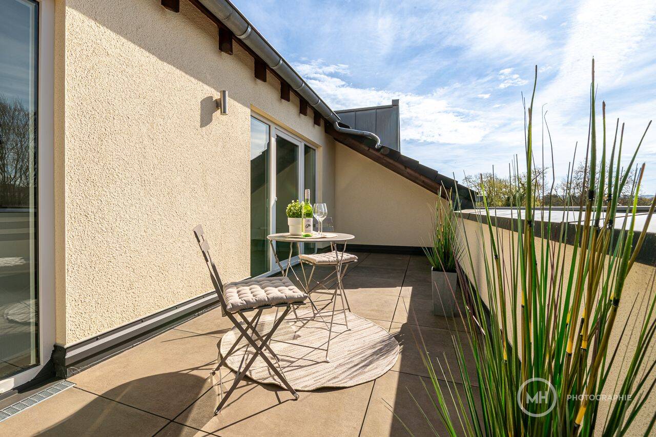 Urbane Wohnqualität im Herzen von Hennef - modern, stilvoll und mit Dachterrassen.Diese außergewöhnliche Eigentumswohnung vereint urbanes Leben mit einem hohen Maß an Wohnkomfort und einem besonderen architektonischen Charakter. Mitten im Zentrum von Hennef gelegen, profitieren Sie von einer idealen Kombination aus zentraler Lage und angenehmer Ruhe.Die Wohnung befindet sich im dritten Obergeschoss eines modernen und äußerst gepflegten Mehrfamilienhauses aus dem Jahr 2002. Der Verzicht auf einen Aufzug bringt dabei einen positiven Nebeneffekt mit sich und sorgt ganz nebenbei für zusätzliche Bewegung im Alltag.Auf rund 90 Quadratmetern Wohnfläche erwartet Sie ein offenes, lichtdurchflutetes Wohnkonzept mit einem ausgefallenen Grundriss, der der Wohnung eine ganz besondere Note verleiht. Im Jahr 2026 wurde die Einheit umfassend renoviert und präsentiert sich heute in einem Zustand, der nahezu Neubauqualität erreicht.Der großzügige Wohn-, Ess- und Kochbereich bildet das Herzstück der Wohnung und überzeugt durch seine moderne Gestaltung sowie ein angenehmes Raumgefühl. Das große Schlafzimmer bietet direkten Zugang zur ruhig gelegenen, rückwärtigen Dachterrasse und schafft damit einen privaten Rückzugsort mit schönem Ausblick.Ein besonderes Highlight sind die beiden Dachterrassen, die sowohl zur ruhigen Innenseite als auch zur Straßenseite ausgerichtet sind und damit sowohl Entspannung als auch urbanes Flair ermöglichen.Das neu gestaltete Badezimmer fügt sich nahtlos in das hochwertige Gesamtbild der Wohnung ein und unterstreicht den modernen Charakter.Abgerundet wird dieses attraktive Angebot durch einen Carport-Stellplatz für ein Fahrzeug der Mittelklasse, der optional für 15.000 Euro erworben werden kann.Diese Wohnung eignet sich ideal für alle, die zentrales Wohnen, moderne Ausstattung und eine besondere Raumaufteilung in einem gepflegten Umfeld zu schätzen wissen.Wir bitten um Verständnis, dass wir nur nach Übermittlung Ihrer vollständigen Daten ein Exposé verschicken und bei näherem Interesse einen persönlichen Vor-Ort-Termin abstimmen.Wir freuen uns auf ein persönliches Kennenlernen.