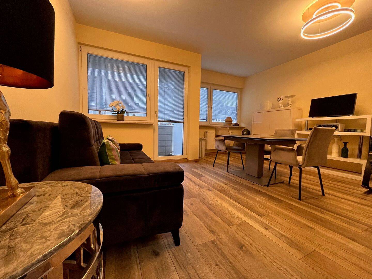 Bei der Nutzung zur Befristeten Vermietung, als möblierte Wohnung, sind die jeweils gültigen gesetzlichen Vorgaben zu beachten.Die folgende Renovierung und Sanierungsmaßnahmen wurden im Sommer 2019 ausgeführtBad:Komplettsanierung mit fast Bodentiefer Dusche, große Regendusche, Wandhängendes WCKompaktwaschbeckenGrohe ArmaturenHorizontale Zu- und Abwasserleitungen erneuertElektrik komplett erneuert, inkl. Neuer AbsicherungNeue Deckenhohe Fliesen, neue BodenfliesenKüche:Neue Designer Einbauküche mit InduktionskochfeldEinbauherd, Mikrowelle und Kühlgefrierkombi Elektrik komplett erneuert, inkl. Neuer AbsicherungDie weitere Elektrik in der Wohnung wurde erweitert inkl. Mediendosen, neue Schalter und neue Steckdosen Böden:Hochwertiges Objekt Laminat in Dielenoptik (sogar für Einsatz im Gewerbe geeignet) schwimmend auf Dämmmatten verlegt.Wände und Deckenin allen Räumen auf Q3 gespachtelt und mit hochwertigen Designfarben gestrichenDecken in weiß gestrichen Klimaanlage:Inverter LG Splitt-Klimaanlage (Kühlen und Heizen) mit Innengerät zentral im Flur und Außengerät auf dem BalkonFenster:Badfenster Kunststoff Doppelisolierverglasung. Die restlichen Fenster wurden in früherer Zeit schon erneuert Kunststoff ebenfalls Doppelisolierverglasung.Möblierung der Wohnung im Sommer 2019: Wohnzimmer; Sofa mit Schlaffunktion italienisches Design und Produktion aus kleinem Design MöbelhausEsstisch und Stühle hochwertige Designer Möbel italienisches Design und Produktion von MöbelhübnerSchrank von Musterring, von MöbelhübnerHochwertige Designer Lampen von MöbelhübnerSide- und High-Bord von Rahaus. Schlafzimmer:Schrank von Musterring von Möbelhübner, Hochwertige Designer Lampe von Möbelhübner, Boxspringbett "Made in Dänemark" von Skandinavischen Bettenhaus.Gästezimmer:Side-Bord und Tisch aus kleinem Design MöbelhausSessel von Rolf BenzBett mit Hochwertiger Matratze von Skandinavischen BettenhausHochwertige Designer Lampe von MöbelhübnerDer Autostellplatz; Sondernutzungsrecht; auf dem Innenhof, kann für 30.000 € zusätzlich erworben werden.